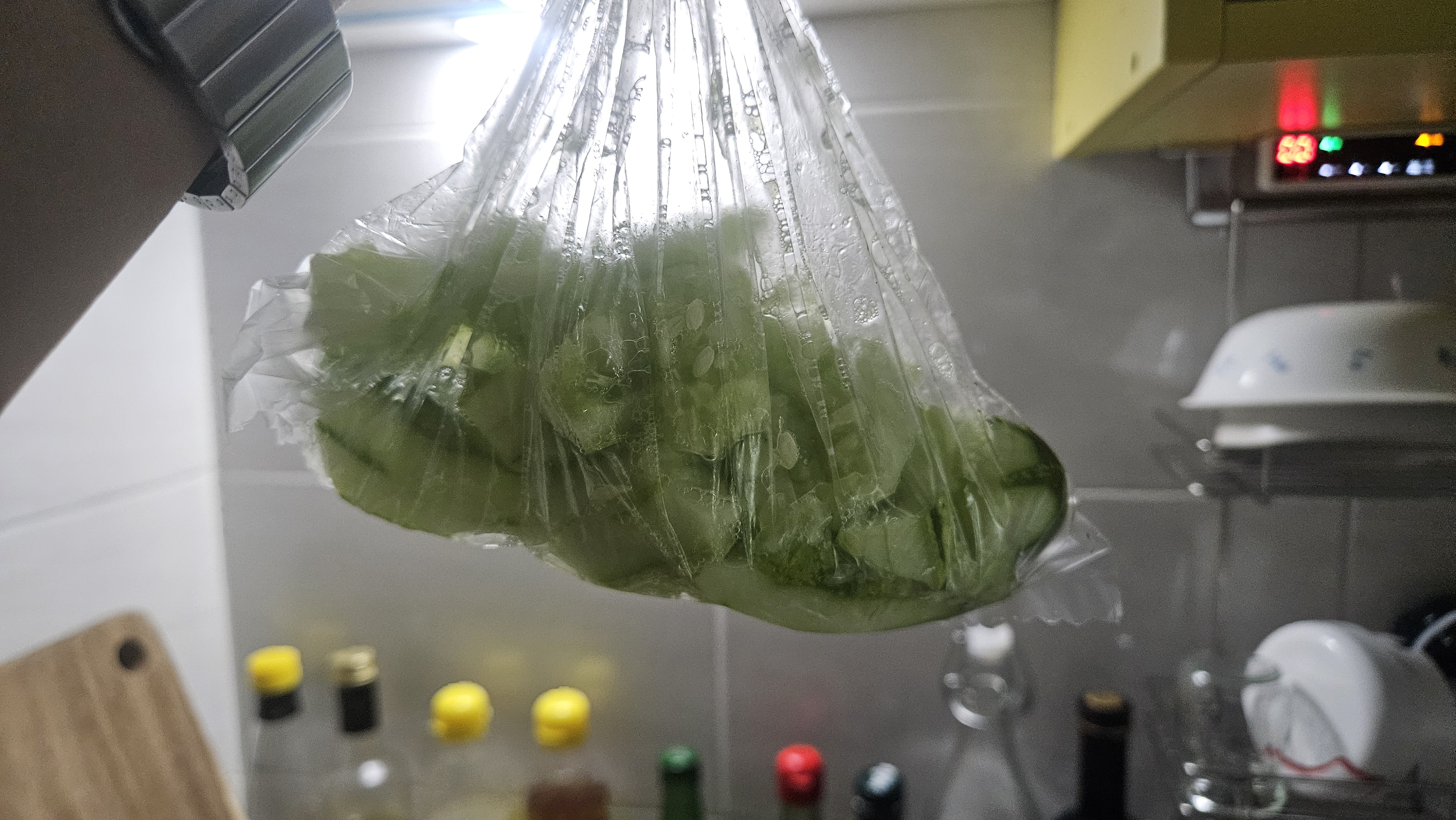 쟁반, 도마 설거지하기 귀찮아서 오이 비닐팩에 넣고 부시고 양념들 봉투에 넣고 섞었어요. 진짜 초단간으로! 마라 소스가 정말 끝에 얼얼하네요. 색다르고 맛있었어요