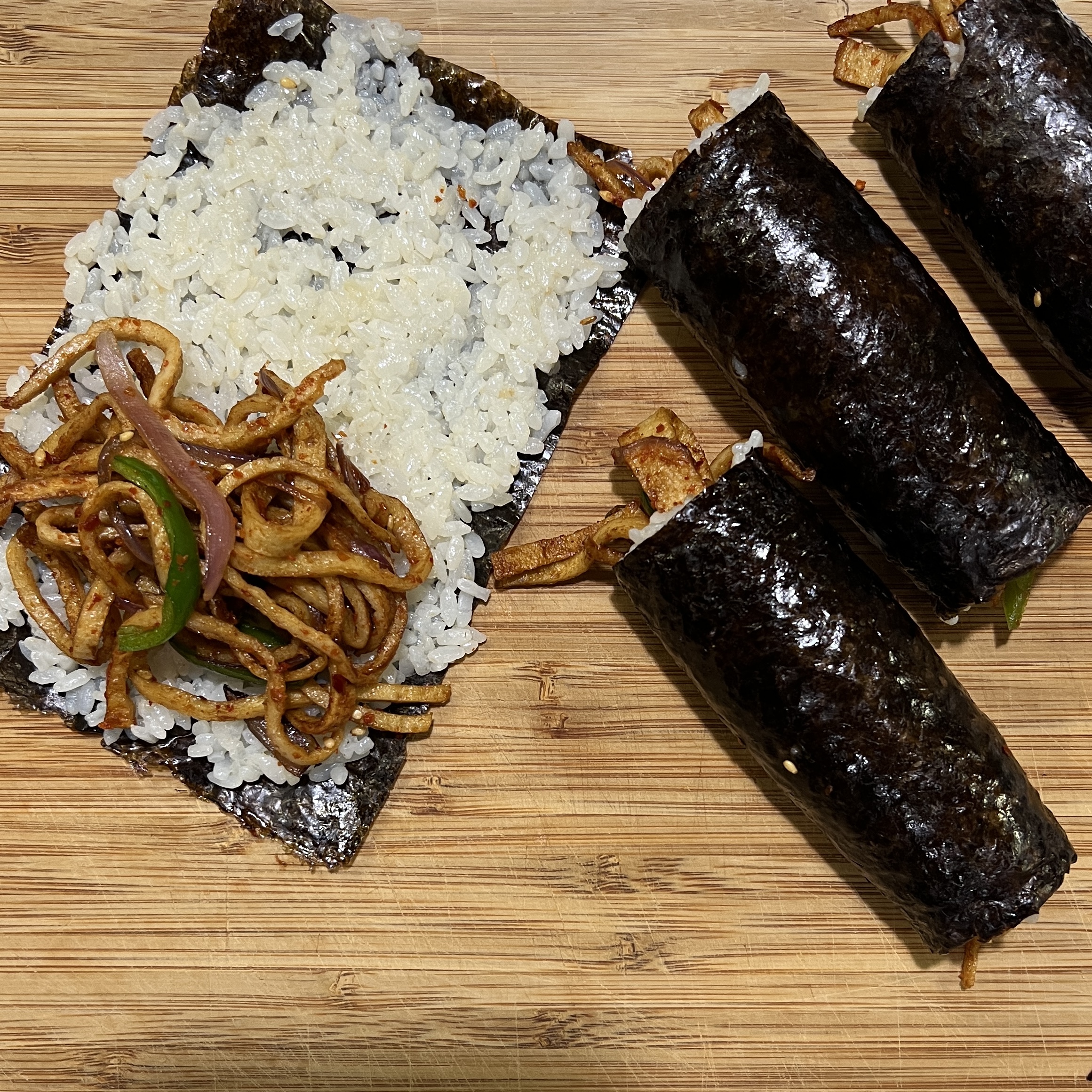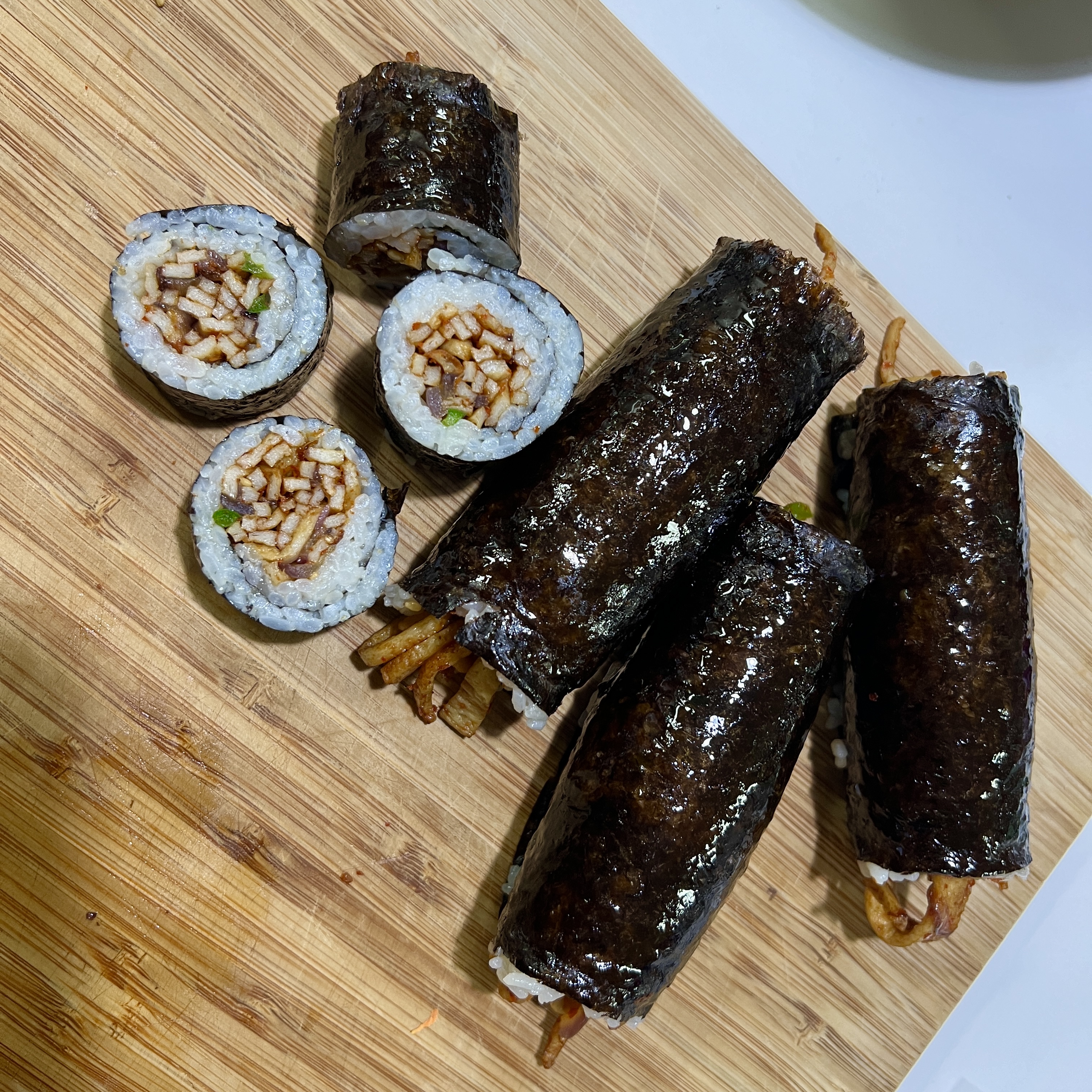 김밥용 김 대신 삼각김밥 김을 사용해서 꼬마김밥으로 만들었고 연두청양초가 없어서 연두순을 넣어서 볶아봤는데 맛있더라고요!