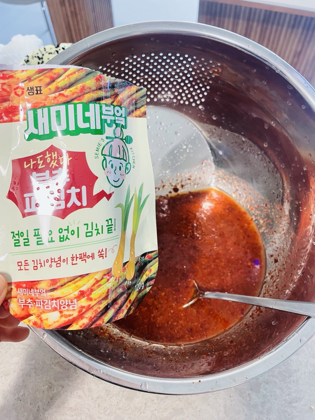 설명서 잘 읽어보고, 양념 만들어 5분 불린 뒤 먹기 좋게 조금 자른 쪽파에 버무려 반나절 실온에서 숙성! 이후 조금은 반찬통에 덜어 울 엄마집으로 가져다 줬어용 ㅎㅎㅎ