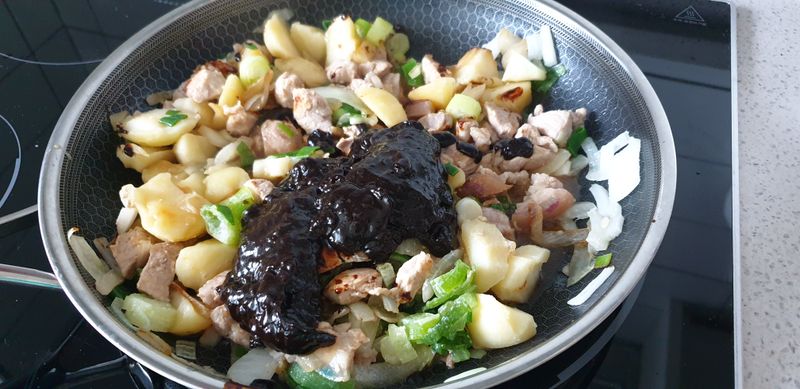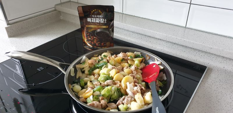 이제 대망의 차오차이 특제짜장 소스를 넣어 주고 레시피대로 5분간 더 볶아 줍니다.