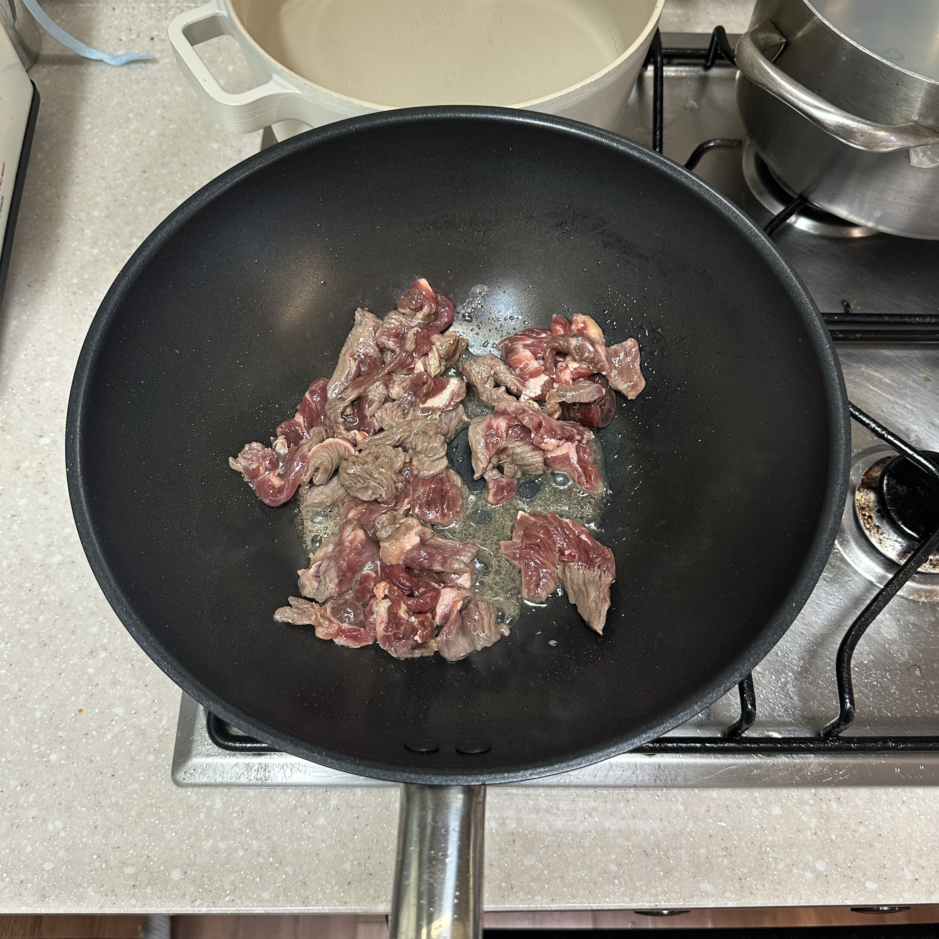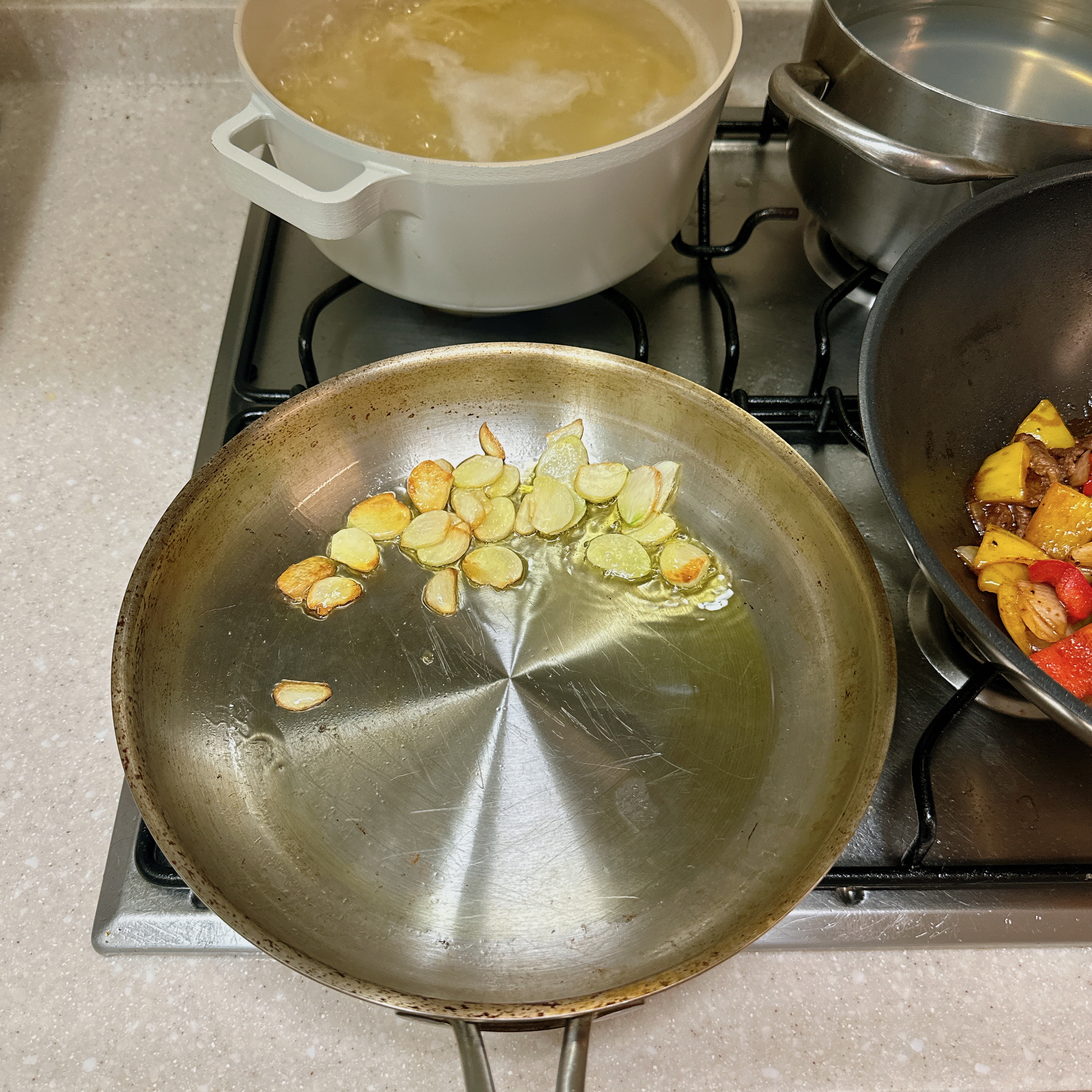재료 준비를 마치고 조금 쉬다가 시간 맞춰 호다닥 요리를 시작했습니다~! 여러 요리를 동시에 하는 것이 쉽지만은 않지만 하나하나 단계를 클리어 할 때마다 오는 성취감이 얼마나 달콤한지! 집에 화구가 4개지만 그동안은 많아야 2개(면 삶기+볶기) 사용했었는데,이번에는 4개를 다 쓰면서 스스로가 기특하고 멋지다는 생각이 들었네요😄 이게 요리하는 재미와 기쁨이겠죠?