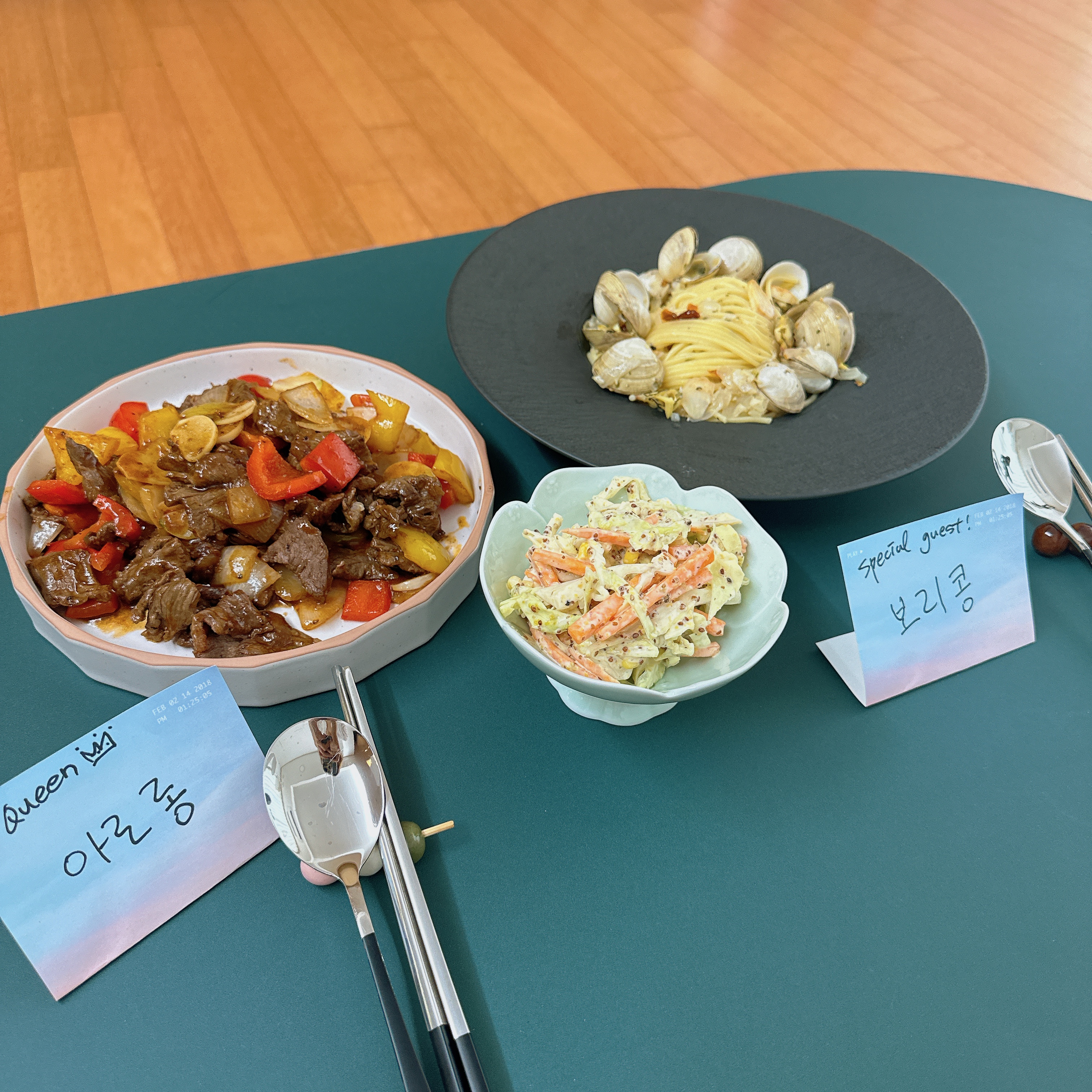 하나하나 그릇에 옮겨 닮을 때도 최대한 예쁘게 하기 위해 플레이팅 방법 정독한거 써먹어보고, 그릇 끝에 묻은 양념도 닦아주며 정성을 가득 담았어요. 또 파티 느낌을 제대로 주기 위해 이름표 세팅까지!!