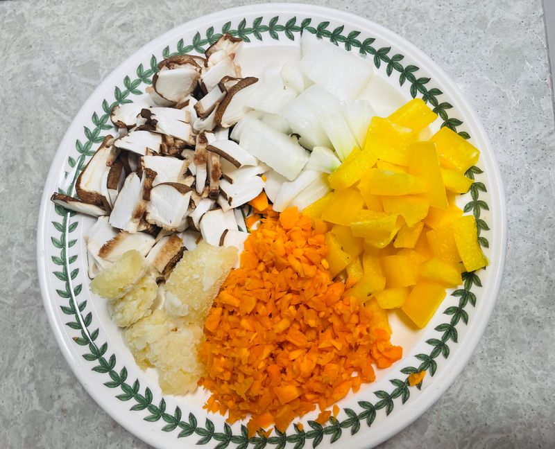 먼저 냉장고에 있던 야채를 털었어요! 편식쟁이라 파프리카 안 좋아하지만, 그래도 뭔가 크게 잘라야 집어 묵던 골라 피해 먹던 할 것 같아서 ㅋㅋ 크게 잘라주고, 안 좋아해도 조금씩은 꼭 넣는 당근은 아예 챠퍼로 다져 주었습니당 ㅋ
