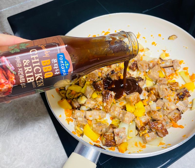 그러곤 손질 해둔 야채 볶고, 다 볶은 후에는 떡갈비 다시 넣어 후루룩 섞어준 뒤 소스를 넣었어요! 소스를 넣기 전 살짝 맛보니 개인적으론 새콤한 맛이 좀 있어서 새콤함을 살짝 그려줄 설탕 반숟갈 넣고, 매콤한 맛 있었으면 해서 무턱대고 고추장을 반숟갈 넣고 섞었습니다 ㅎㅎㅎ