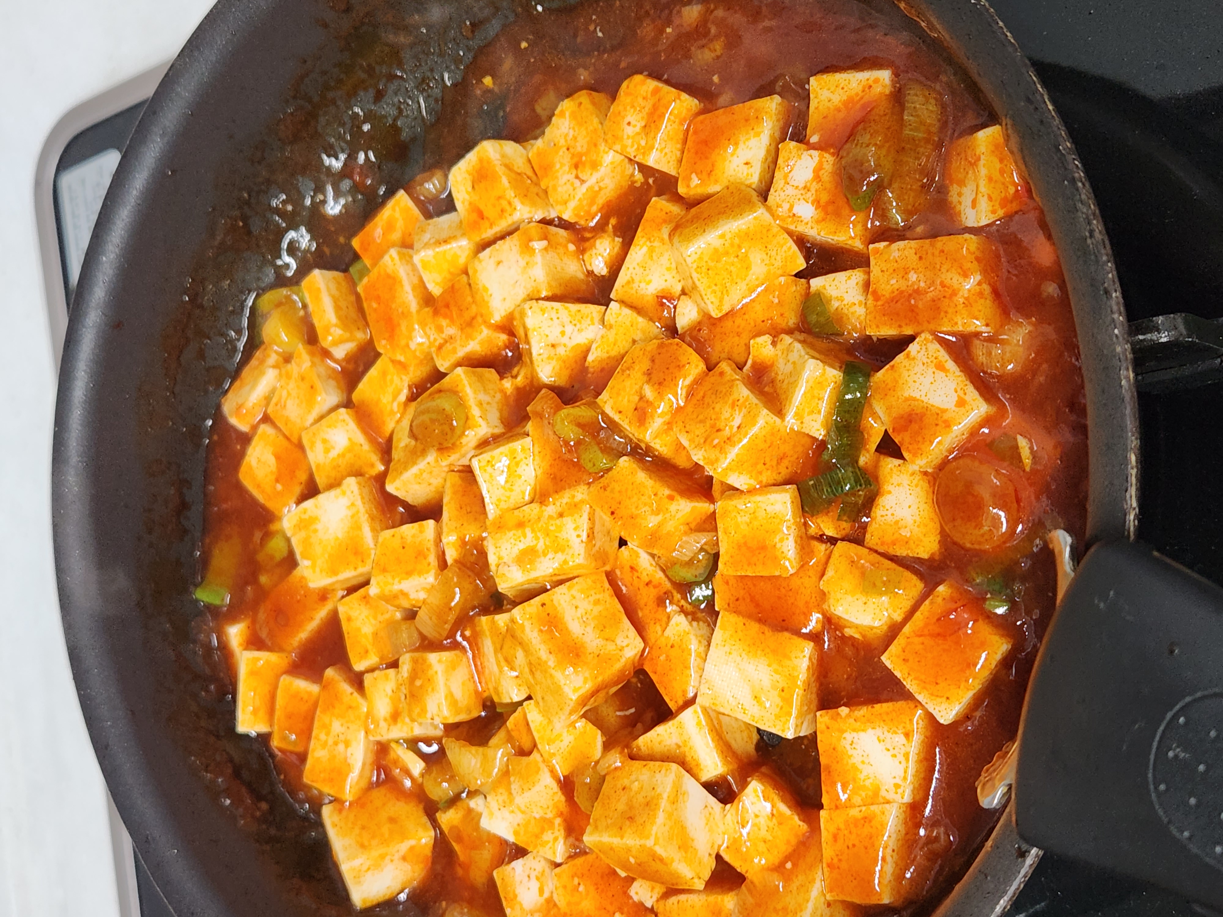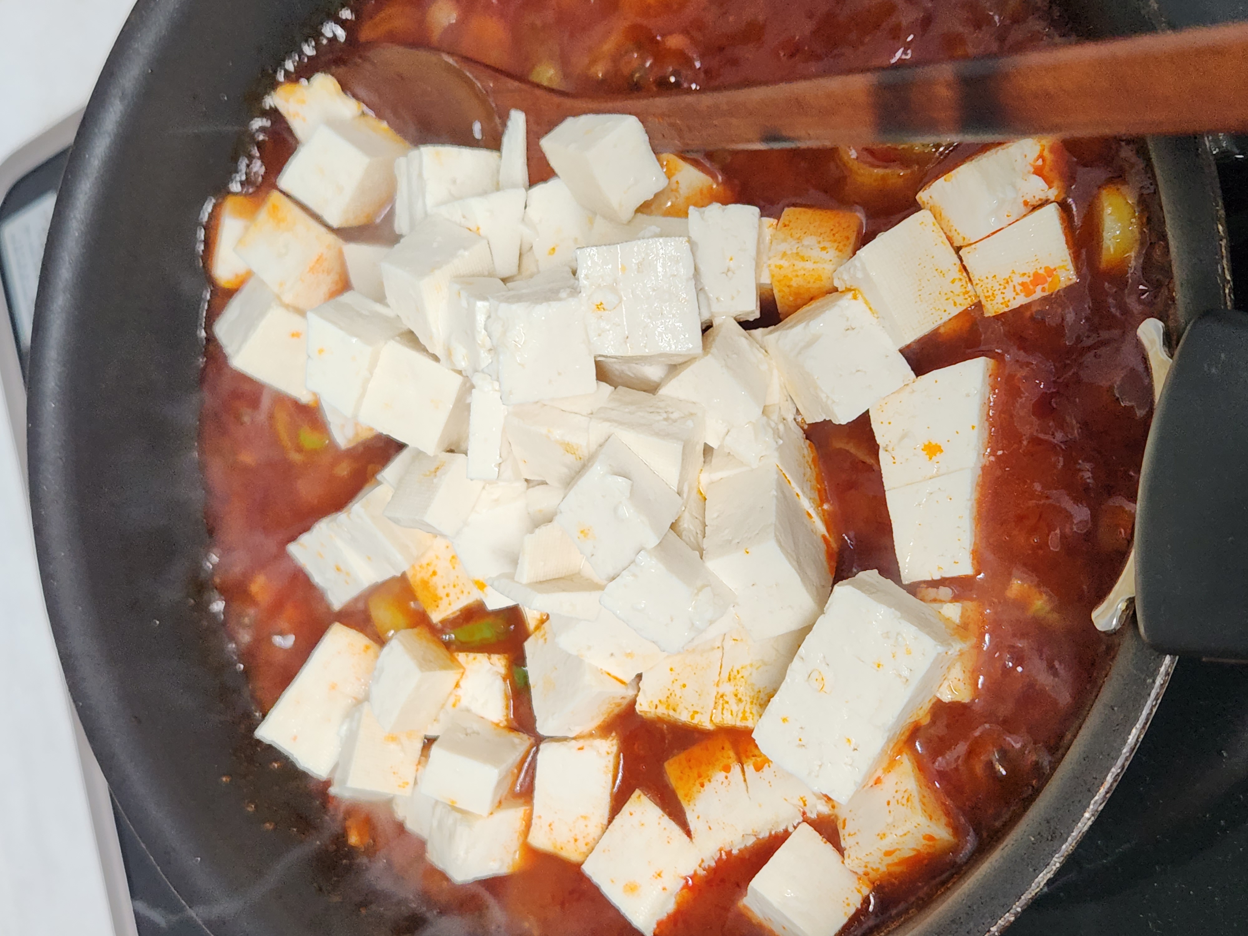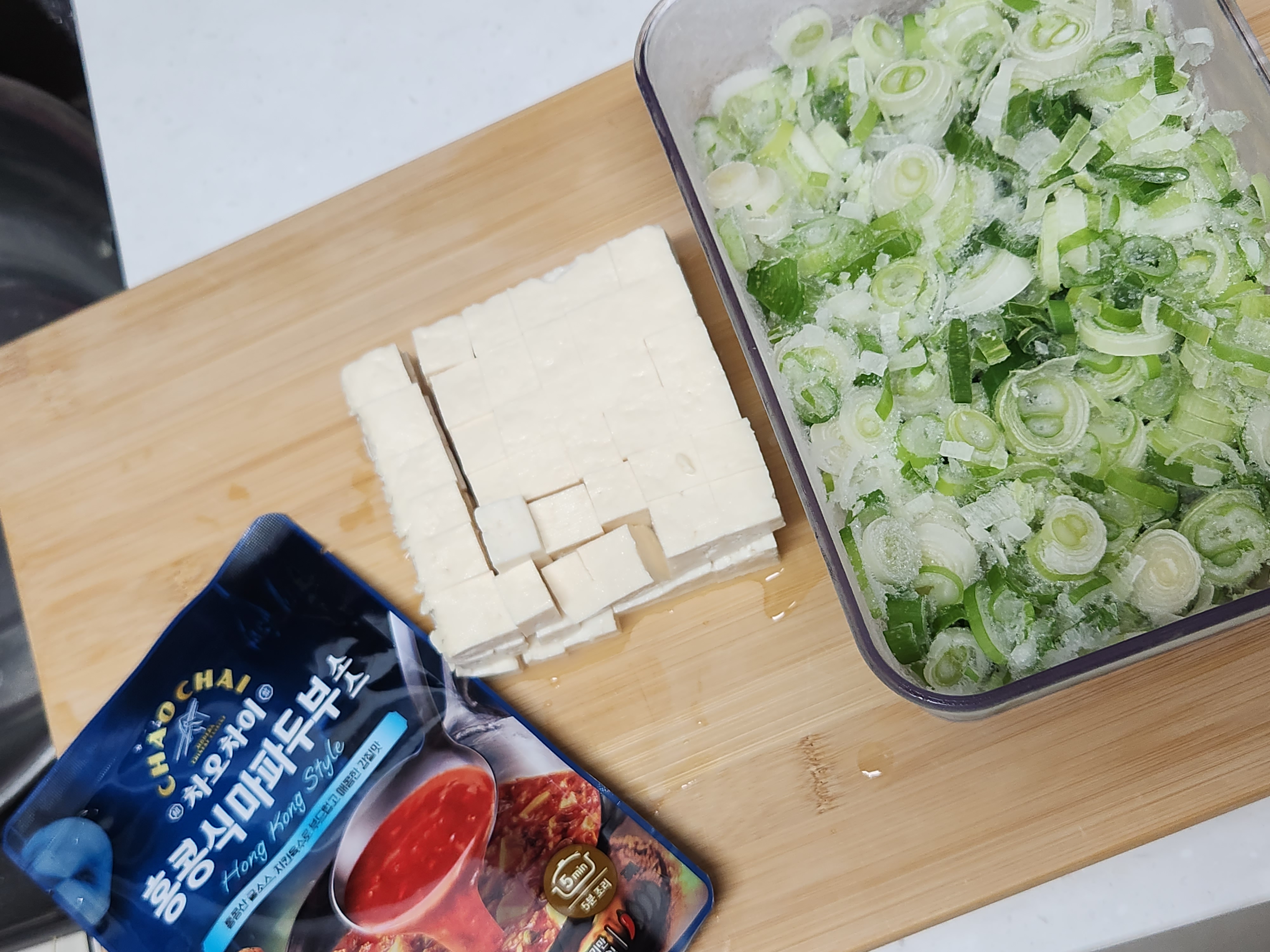 차오차이와 두부만 있으면 마파두부를 뚝딱 완성할 수 있더라고요. 바로 두부를 잘라 레시피대로 만들었어요. 시간도 짧고 집에서 도전하기 어려운 음식을 간단하게 만들 수 있다는 것이 특징이었어요.