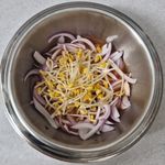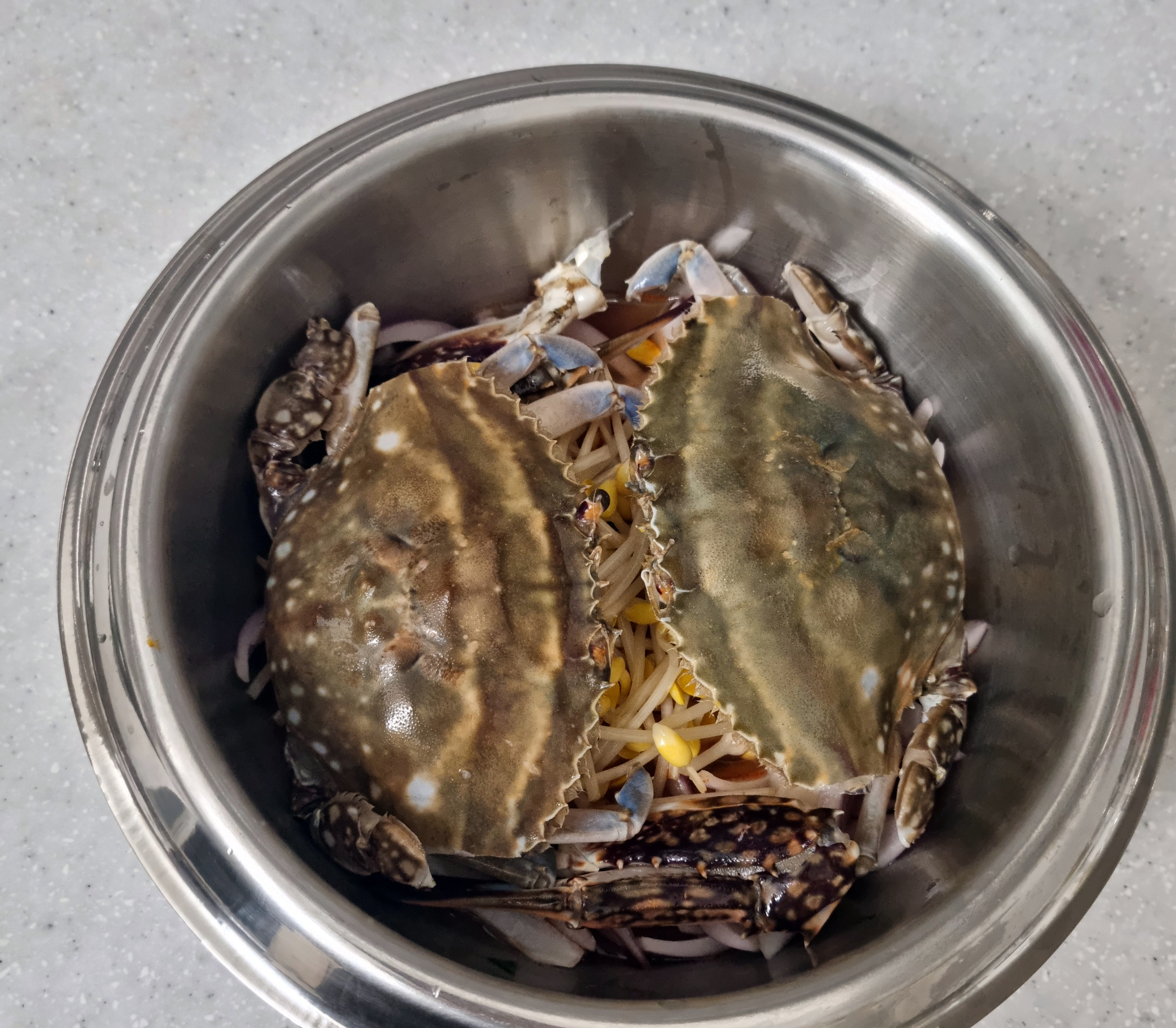 다데기양념 물에 풀고 양파, 대파, 콩나물을 먼저 넣은 후 꽃게를 채소 위에 얹어요.