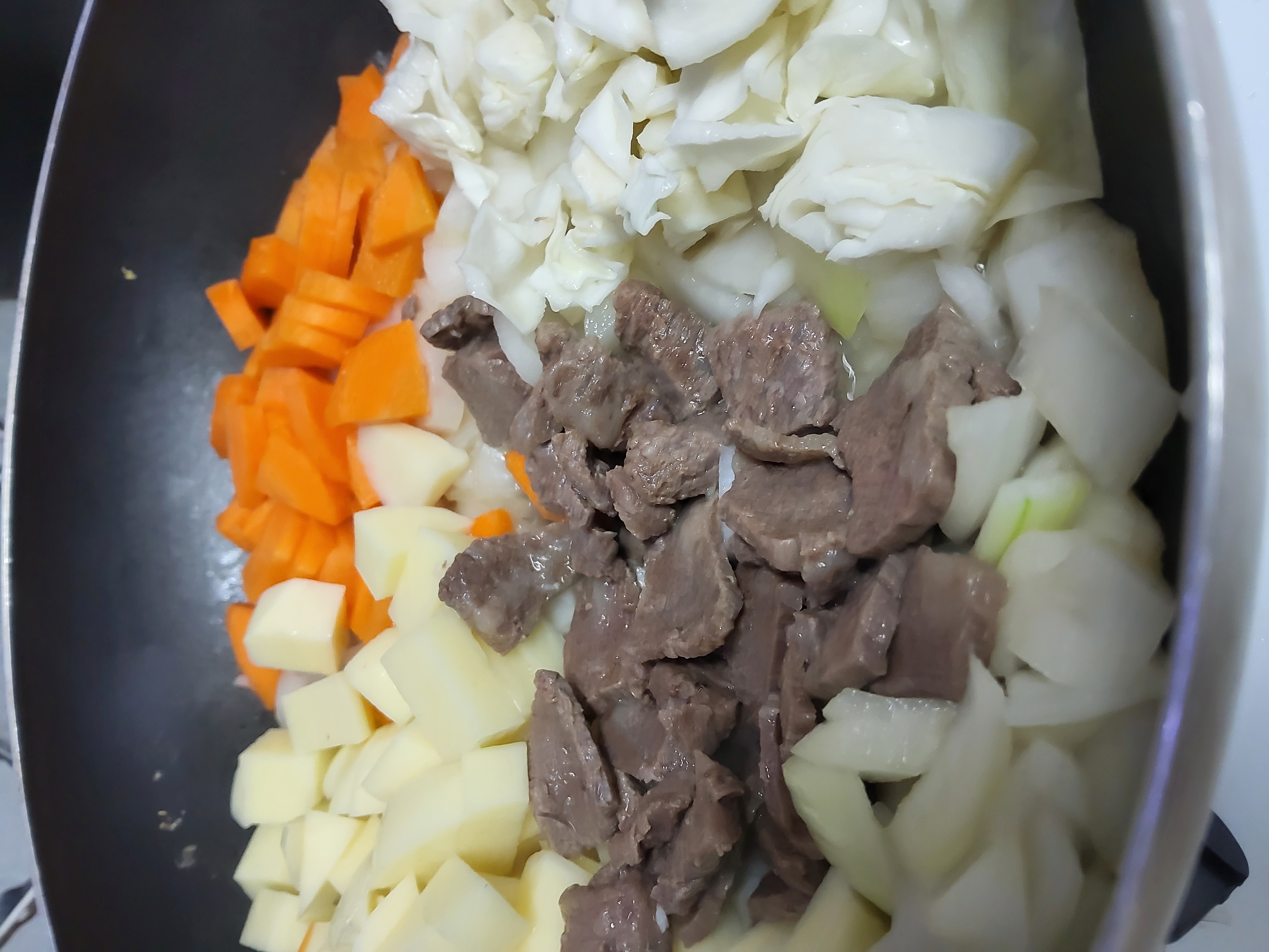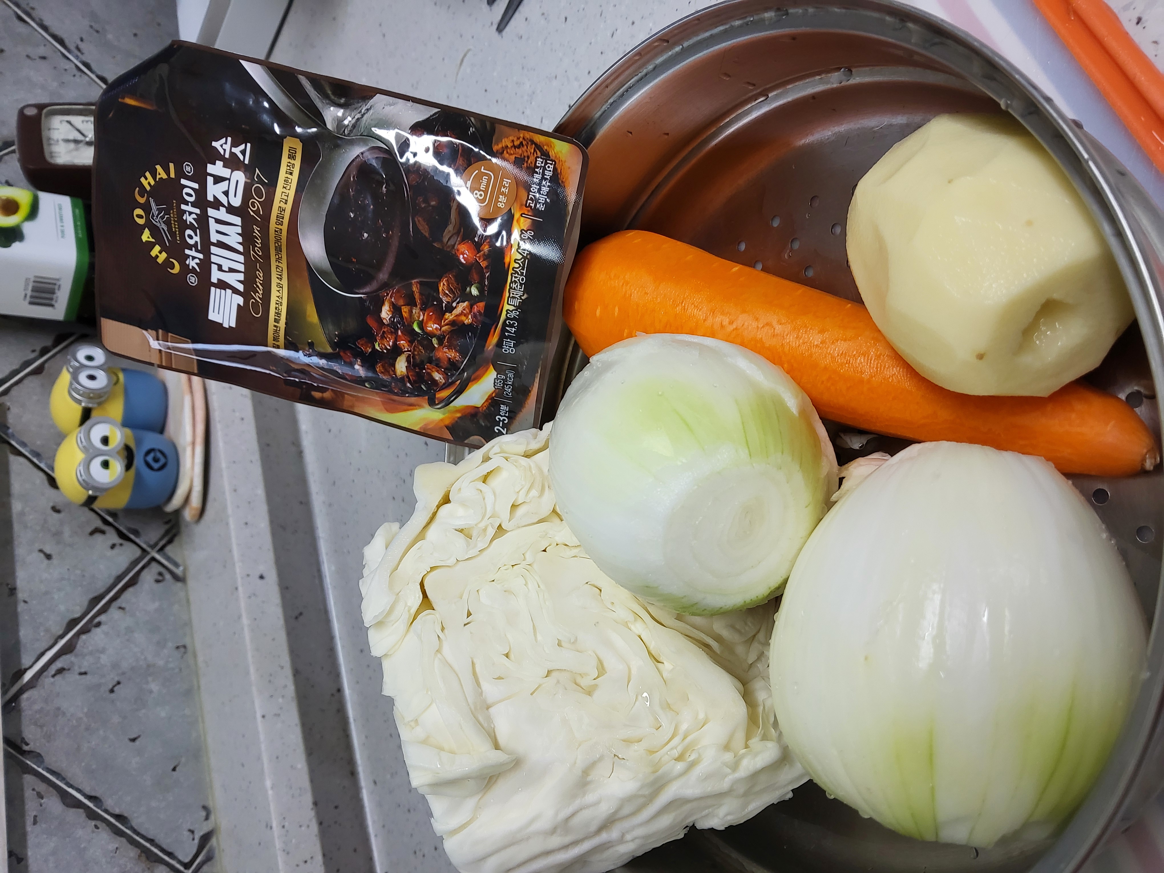 양파.양배추,당근.감자를 볶다가 특제짜장소스넿고