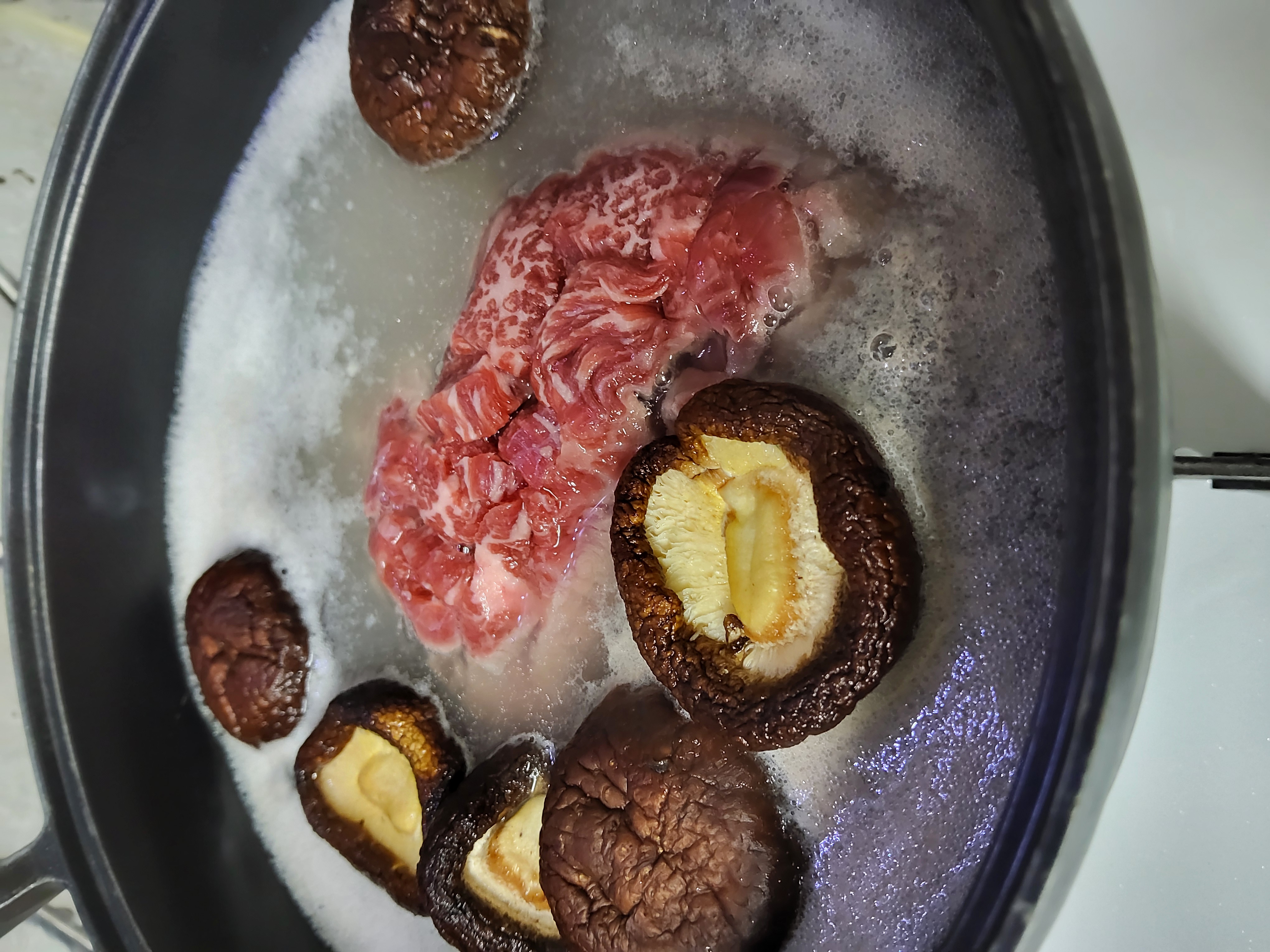 소고기,표고버섯.마늘을 넣어 뿍 끓여 육수물 준비