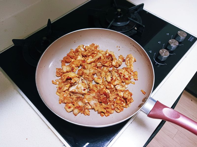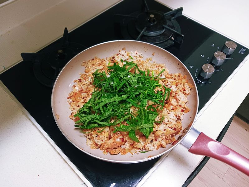 : 밥을 넣고 섞을 때에는 잠시 가스불을 끄고 섞어