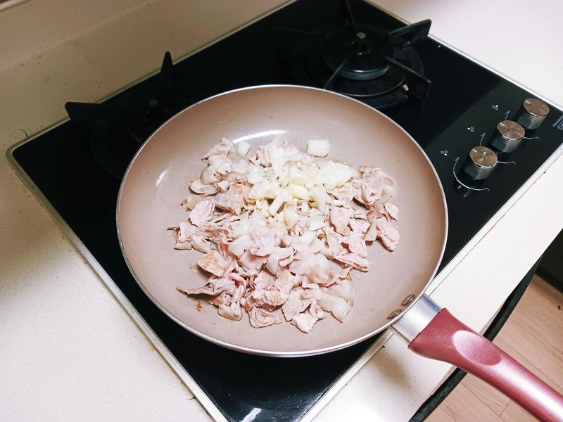 [재료] : 밥 2공기, 대패삼겹살 반 줌[60g], 양파 1/3개,