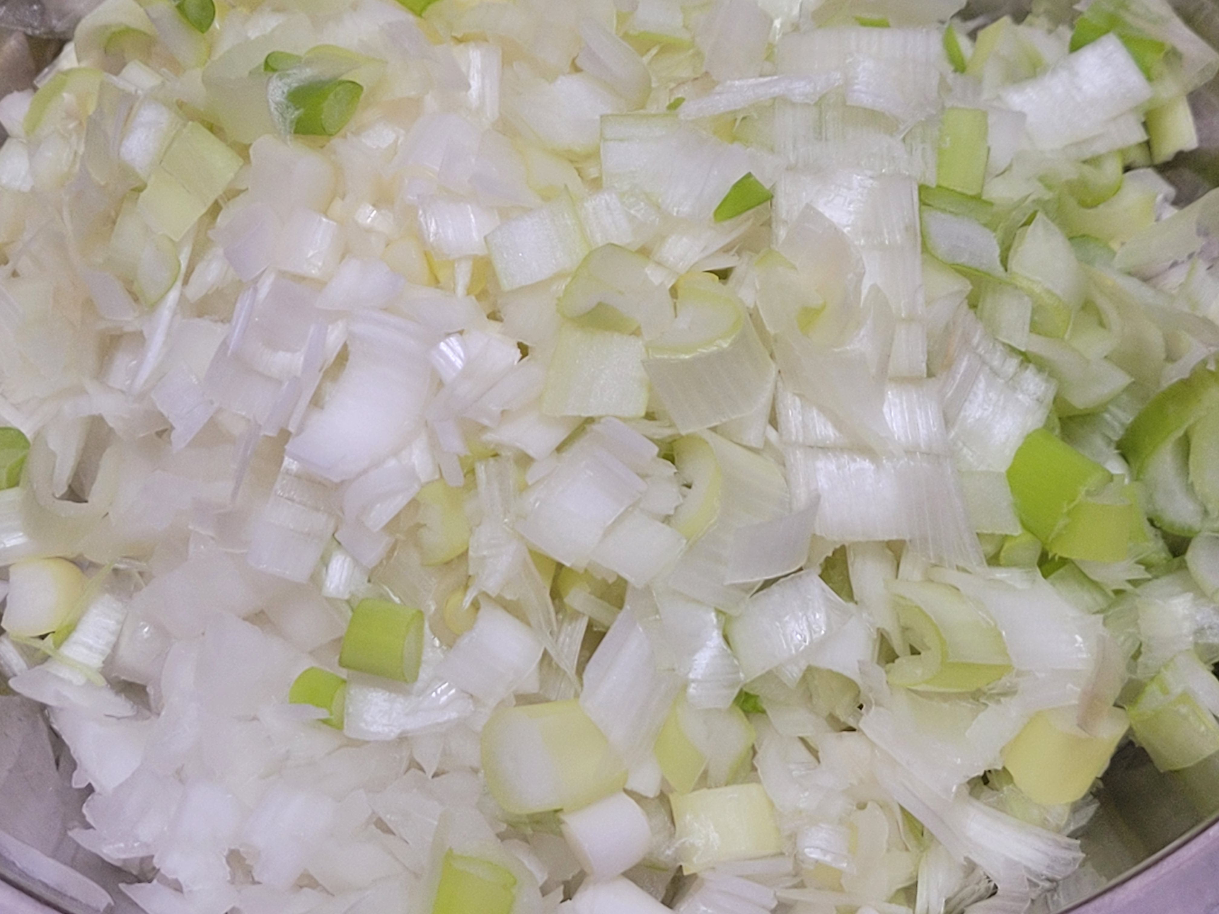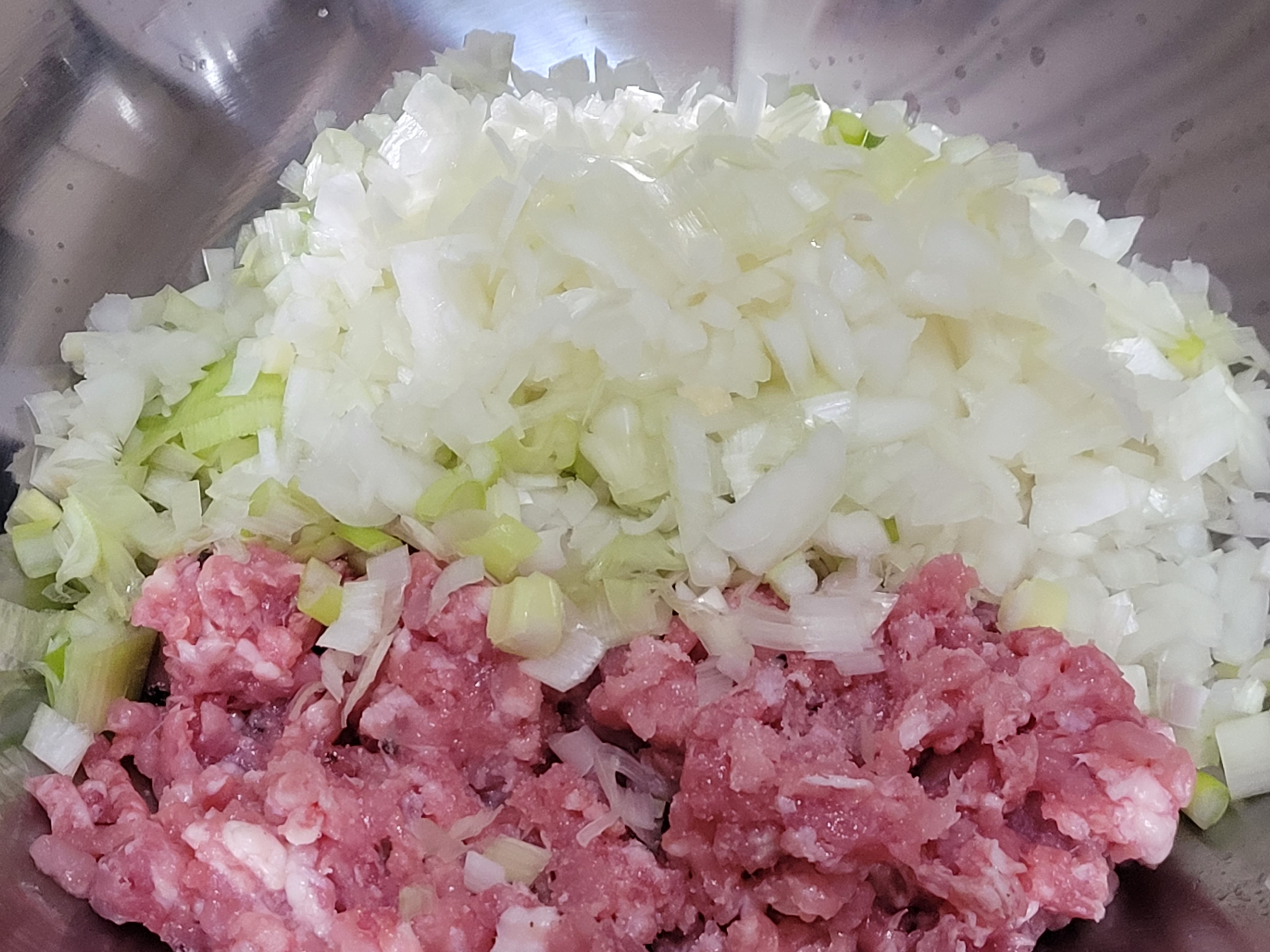 다진 대파, 양파, 마늘을 고기 반죽에 넣고 버무려준다