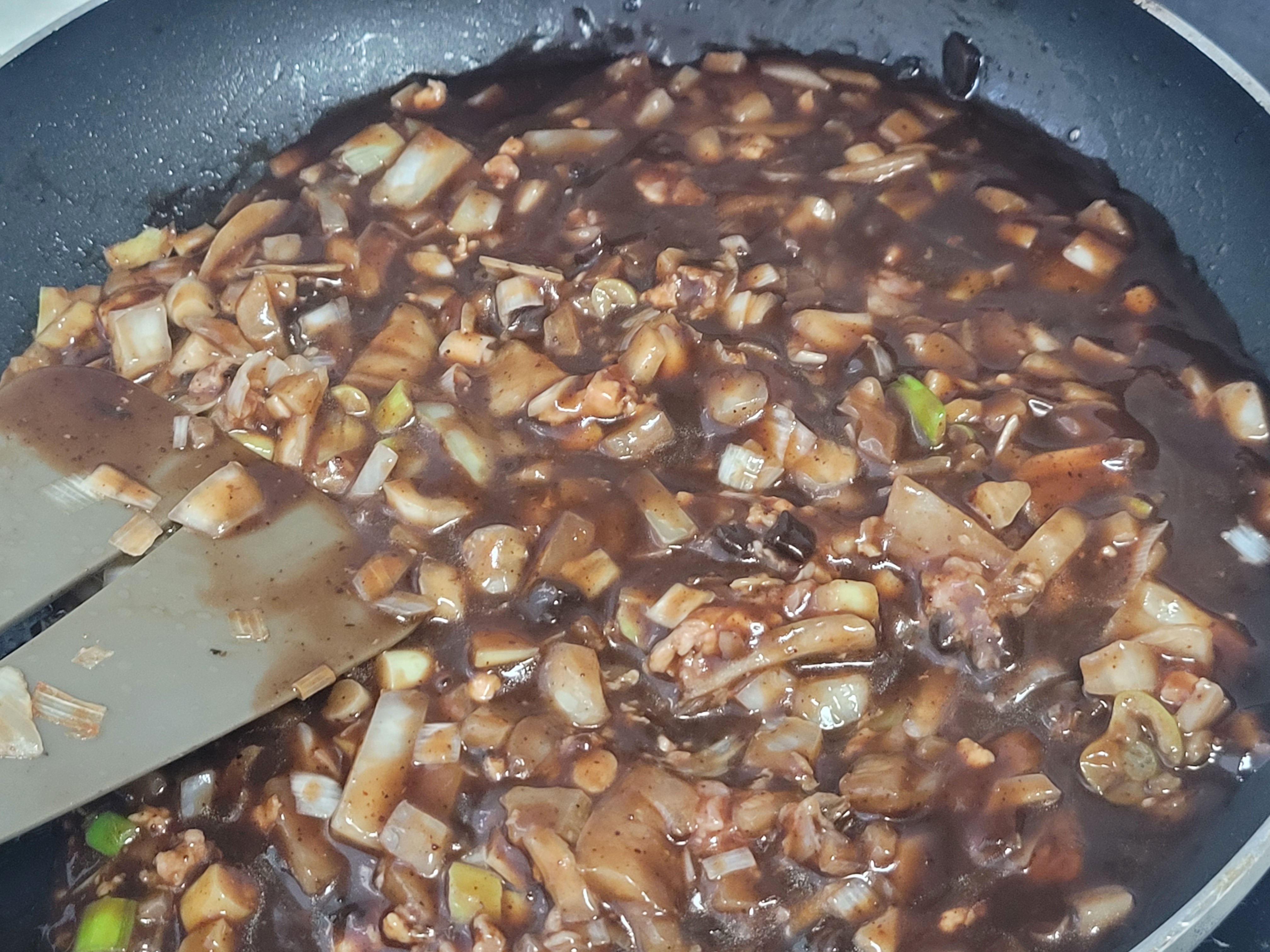 다진 채소들과 데미글라스 소스를 함께 끓여준다