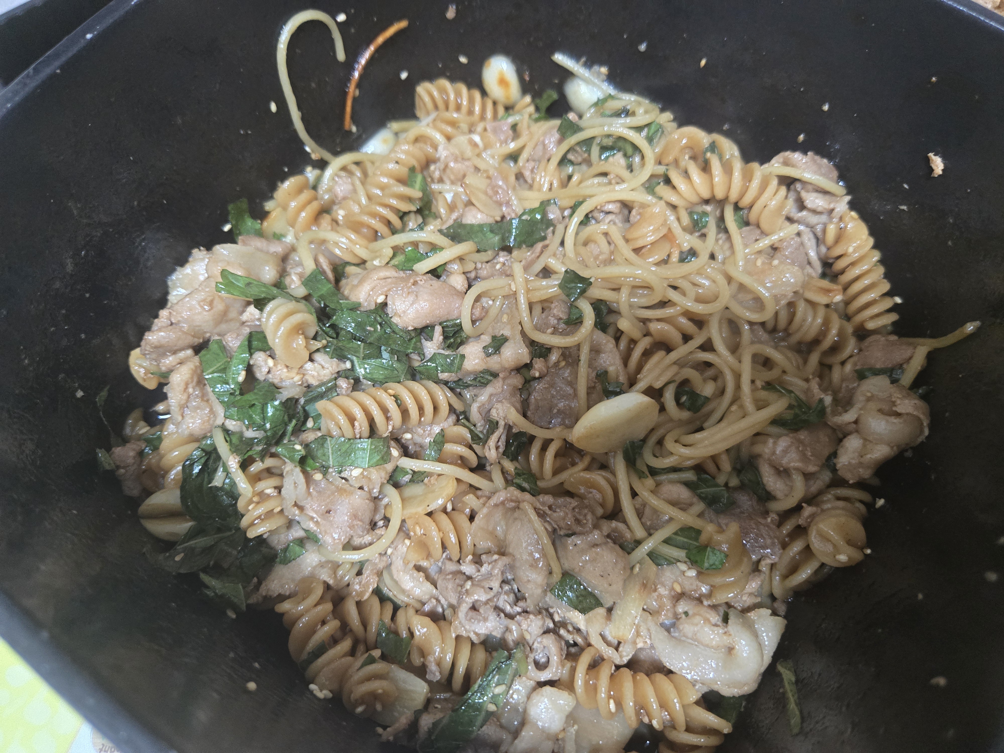 간장2.굴소스2.설탕1.후추.마늘.소금.깻잎. 오린엔탈소스1.대패삼겹살.폰타나파스타면.집에있던푸실리파스타면 으로 만든 즐요클럽) 양식- 대패삼겹살불고기파스타 만들었어요!!!
