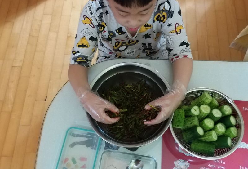 잘 절여진 오이는 물에 살짝 씻어서 물기를 뺀다.