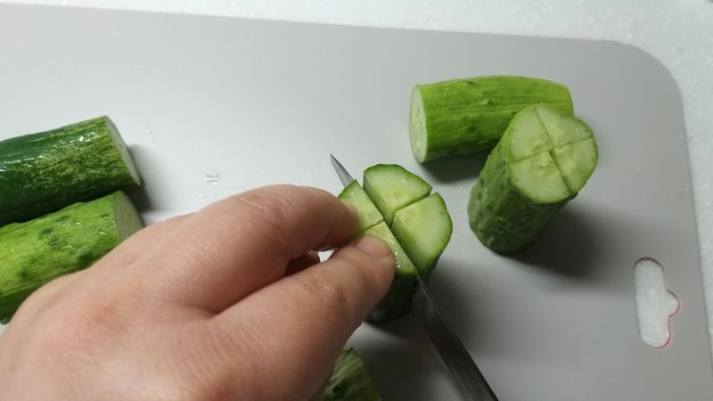 물기를 뺀 오이 사이에 양념을 넣어준다.