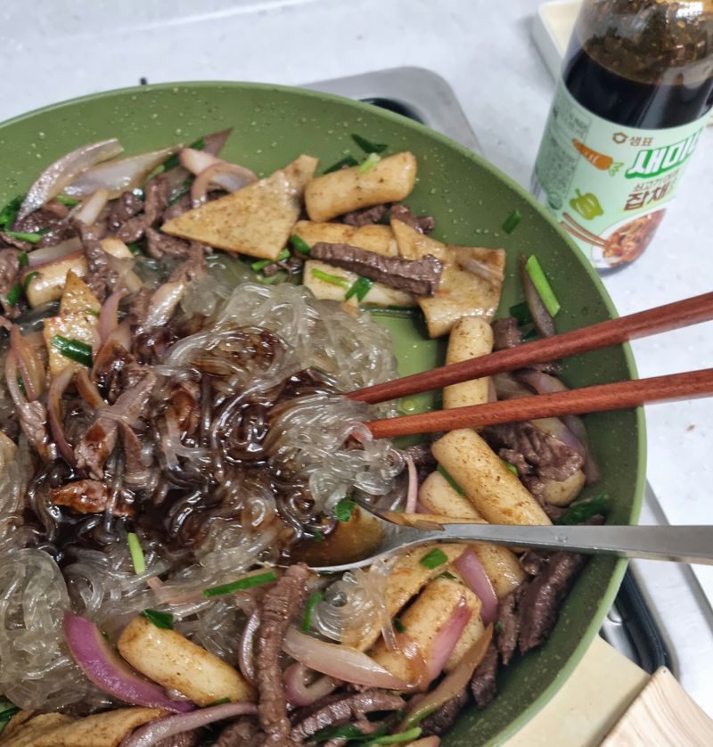 진짜 초간단잡채!! 있는재료 볶고 불린당면 4분 삶아 재료, 소스와 쉐킷하면 끝~~ 소고기, 양파, 어묵, 떡 넣었어요 넘 쉽고 맛있어요😆
