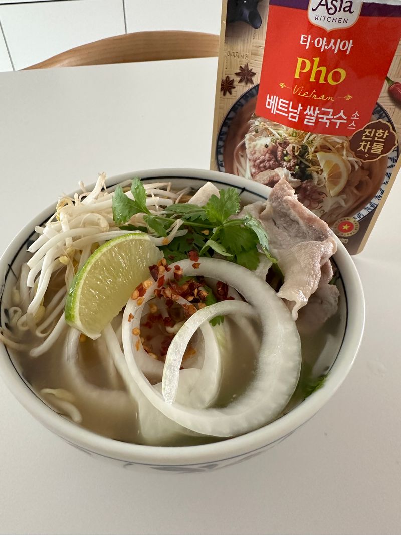 티아시아 쌀국수 소스로 간단하게 만든 쌀국수에요 숙주듬뿍 고수 듬뿍 올려 냉동실 고기로 맛나게 먹었어요.