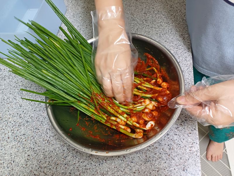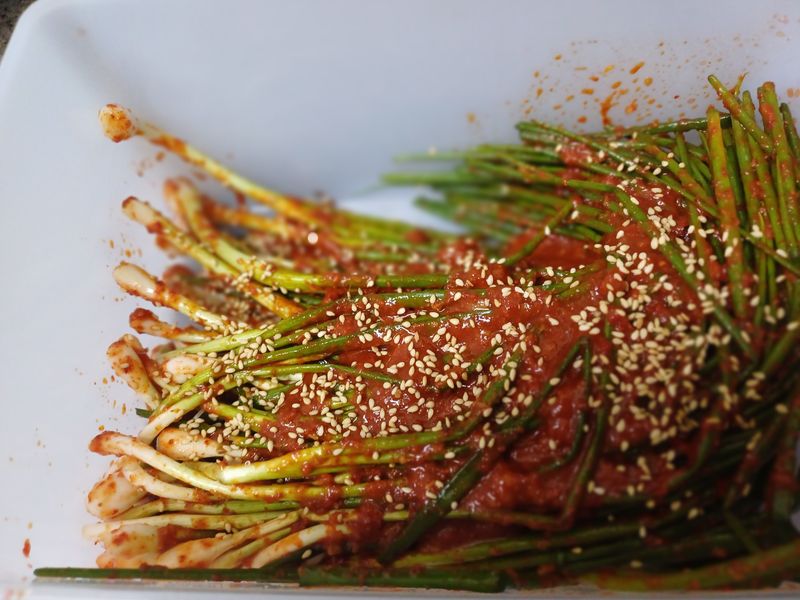 준비물: 쪽파랑 새미네파김치양념, 깨!!! 1. 쪽파를 깨끗하게 다듬어요. 2. 양념이랑 고춧가루 물120미리를 섞어요. 3. 조금 불려둔 양념을 파김치에 머리부터 발라줘요. 4. 깨 뿌려주고 이틀정도 상온에 보관후에 맛있게 먹어요.