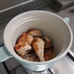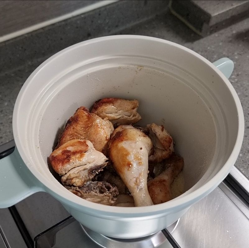 ✦센불에서 1분 동안 예열된 팬에 포도씨유 4스푼을 두르고 손질한 닭을 넣어 양면 골고루 지져주세요. (5분)