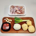 - 닭(닭볶음탕용) 1마리(1kg), 감자 2개(250g), 당근 1/2개(100g), 양파 1개(200g), 대파 1/2개(50g), 통마늘 7개(25g), 포도씨유 4스푼(40g), 물 1.5컵(300g)