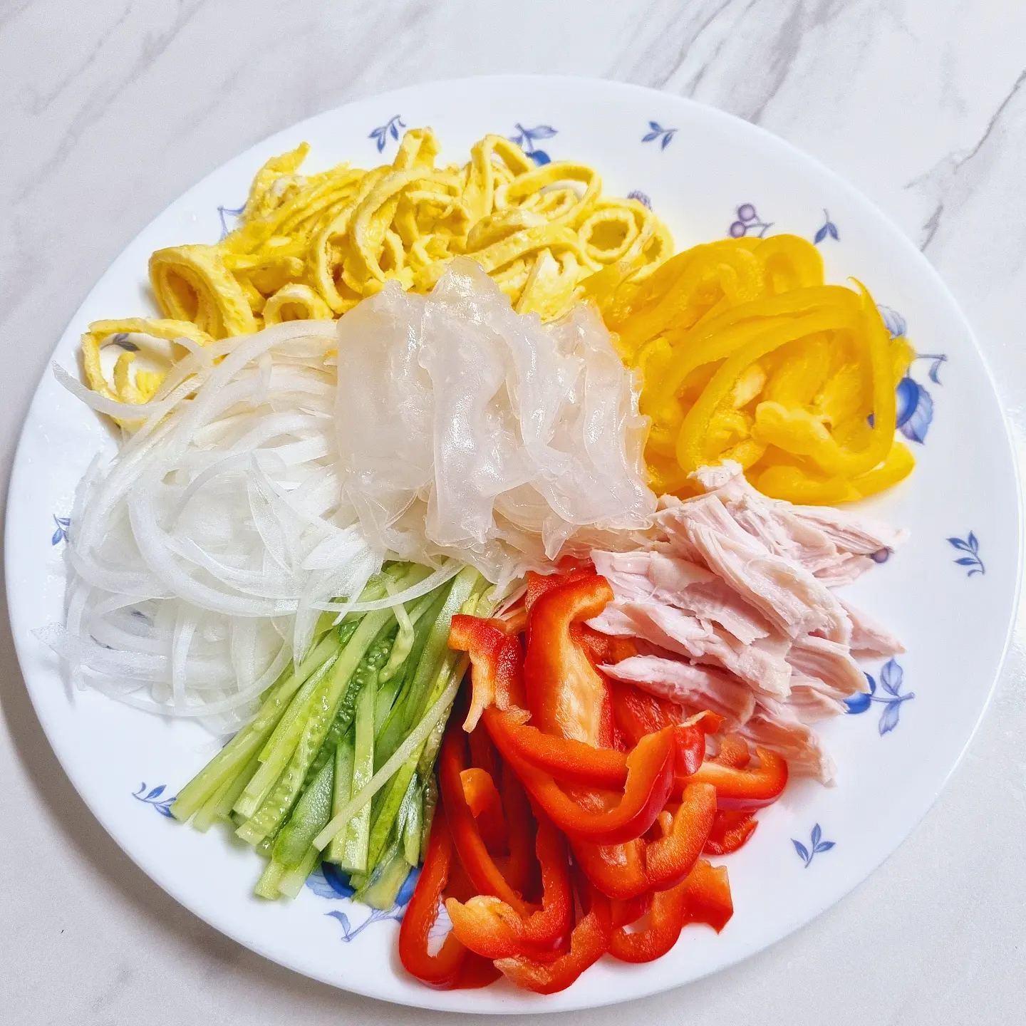 파프리카, 오이, 양파, 계란지단을 채썰어 준비합니다.