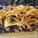 깨와 참기름에 소금 간을 한 밥을 김 위에 깔고 달걀 프라이를 올린 뒤