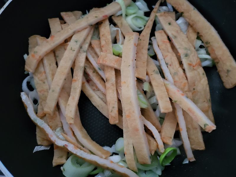 썰어놓은 채소와 어묵을 식용유에 볶습니다.
