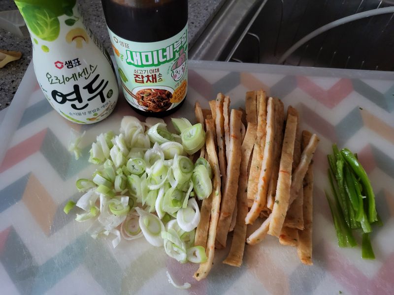 어묵과 양파, 고추를 채 썰어 준비해요.