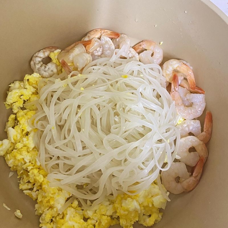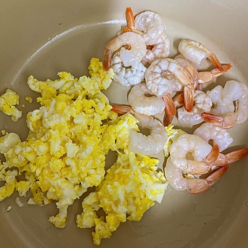 스크렘블한 계란과 새우를 듬뿍 넣고 숙주를 넣어 볶으면 완성이 되는