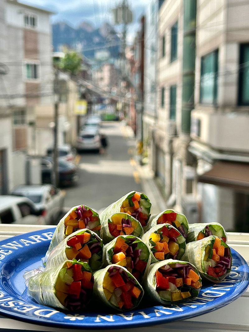 월남쌈은 나의 기호에 맞는 야채를 채 썰어 월남쌈 밑에 깻잎을 넣고 모든 야채를 섞어 돌돌 말려주면 끝!