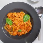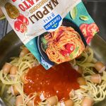 익힌 야채와 버섯이 있는 팬에 파스타소스를 넣어 주고, 파스타를 건져내어 함께 잘 섞이도록 볶아 줍니다