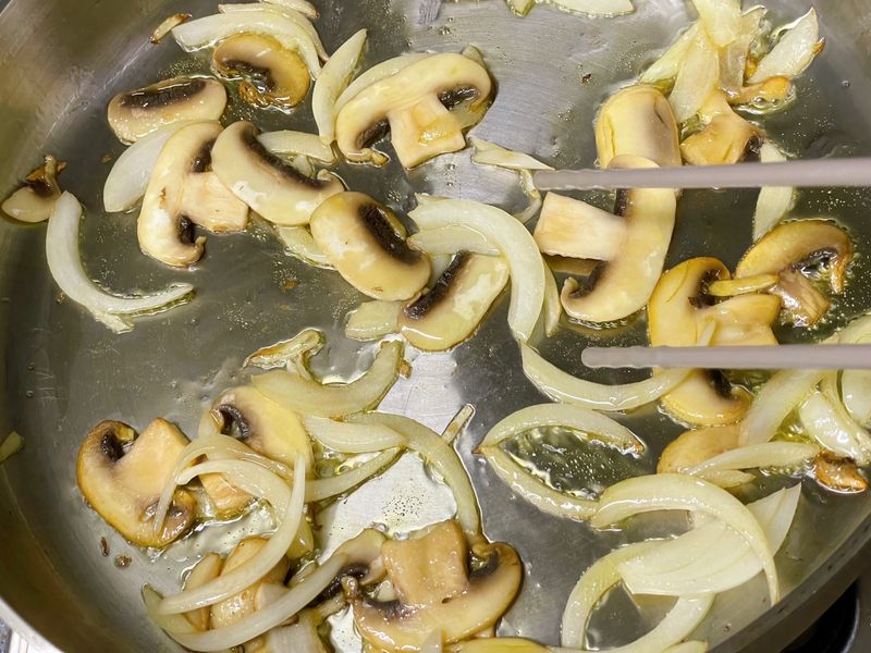 달군 팬에 식용유를 부어주고, 집에 있는 야채나 버섯을 익혀 줍니다