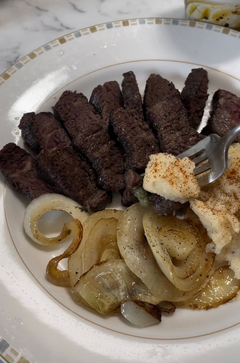 마지막에 양파도 남은 소스에 버무리고 매쉬포테이토도 만들어 스테이크랑 같이 먹으니까 이 조합 진짜 최고랍니다👍🏻