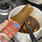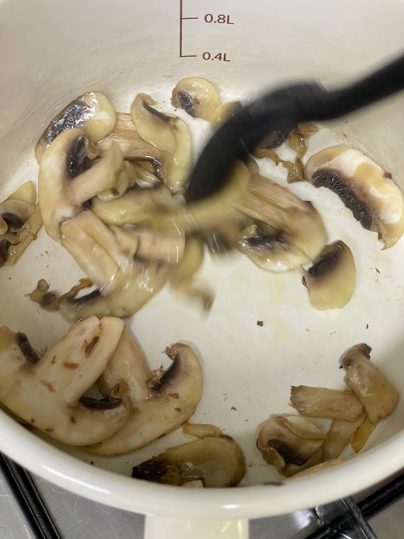 자른 양송이버섯을 오일 두른 팬에 볶은 후, 데미글라스 소스를 넣고 바글바글 끓입니다. 완성된 함박스테이크에 부어서 곁들여 드세요