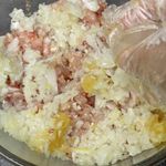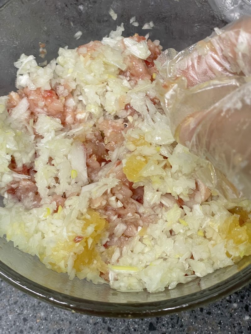 돼지고기 및 소고기 다짐육을 넣고 연두순, 참기름, 후추를 갈아서 손으로 치대 주세요