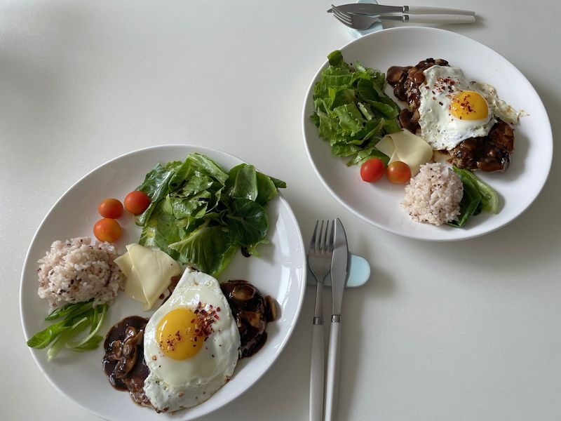 달군 팬에 식용유를 넣고 계란후라이를 반숙으로 만들어 줍니다