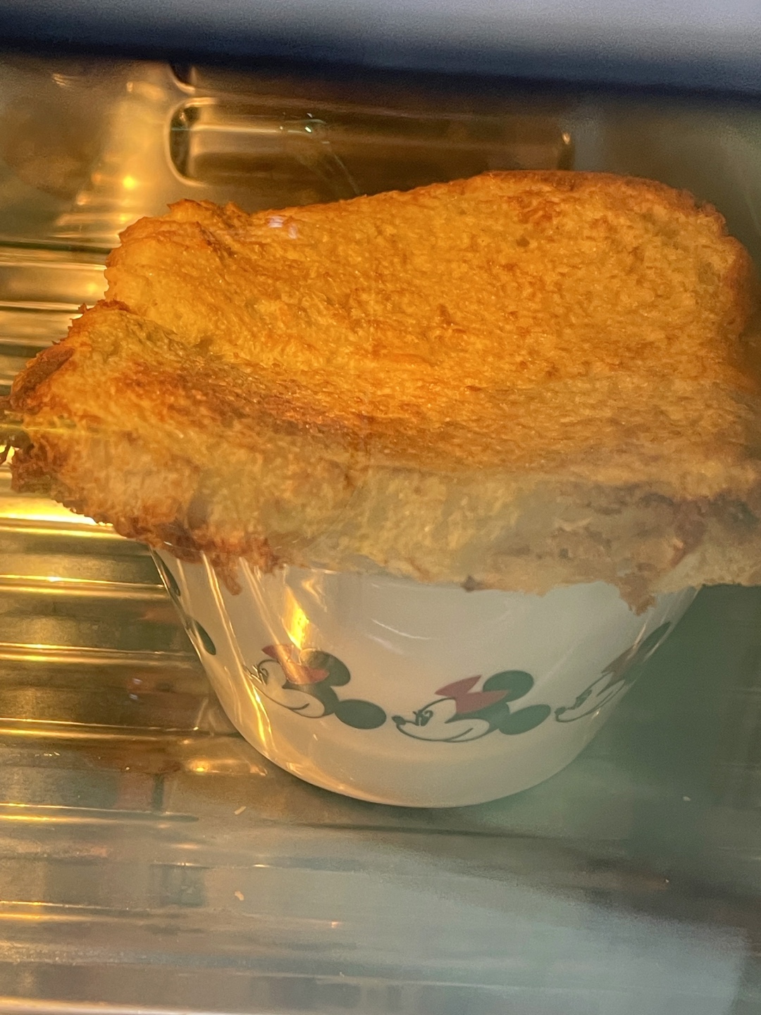 내열용기에 수프를 넣고, 얇게 편 식빵을 내열용기 위에 덮어 주세요