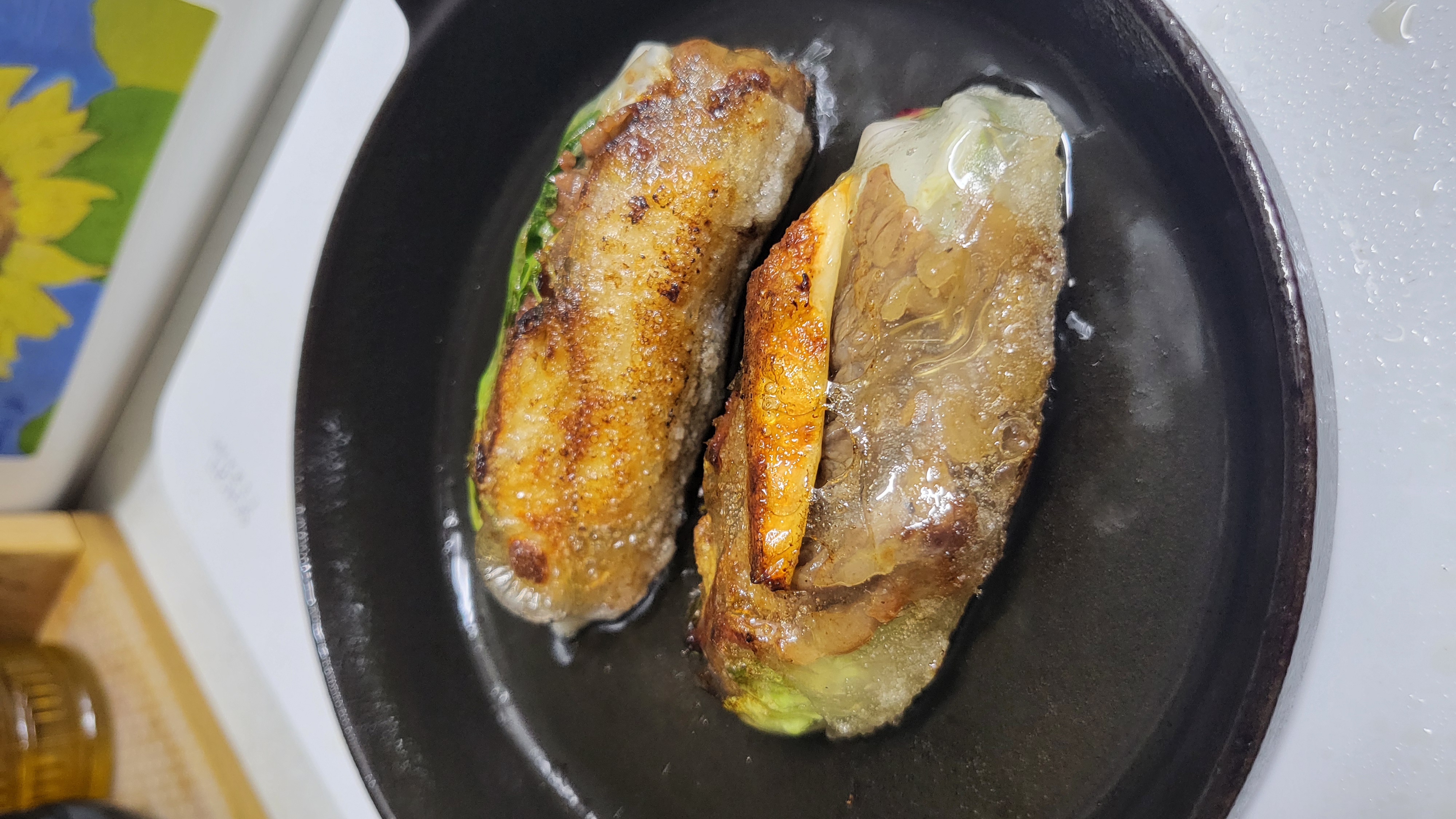 2.팬에 기름을 두른 후 라이스페이퍼 말이를 넣고 굽듯이 튀겨낸다.