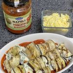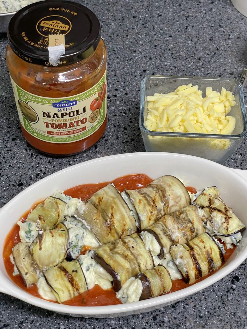 Step 4. 토마토소스 위에 가지말이, 치즈 얹어서 굽기