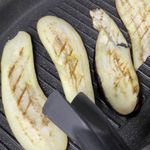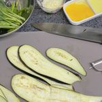 가지는 세로로 길고 얇게 썰어 주세요. 썰어둔 가지에 소금과 후추를 뿌려 밑간을 한 후, 예열한 그릴팬에 앞뒤로 노릇하게 구워주세요