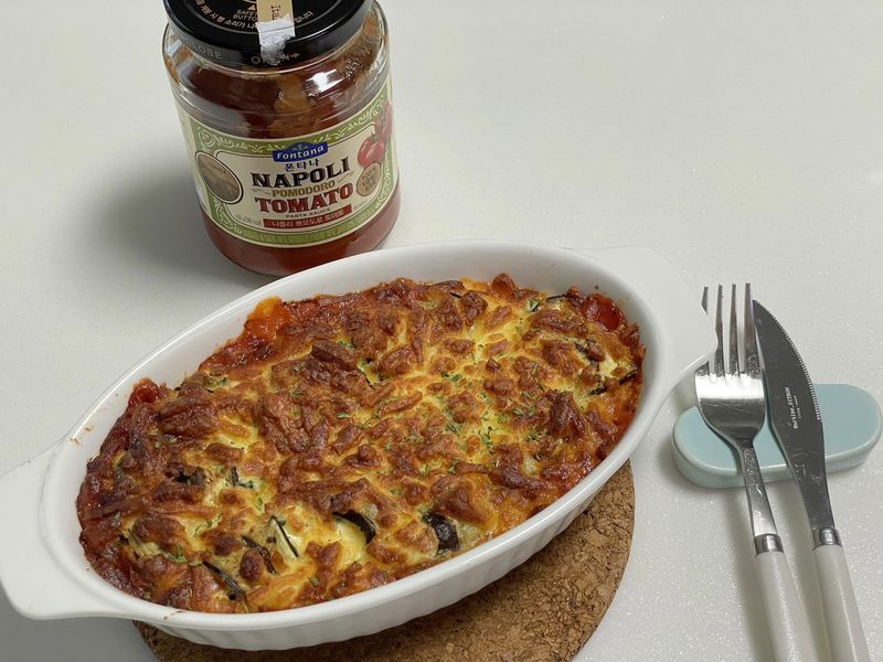 내열그릇에 토마토소스를 담고 준비한 가지말이를 올린 뒤, 피자치즈를 뿌려줍니다. 180도 예열된 오븐이나 에어프라이어에 10~15분 구워주면 완성