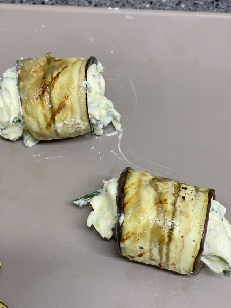 구운 가지 위에 속재료를 한 수저 올리고 돌돌 말아주세요