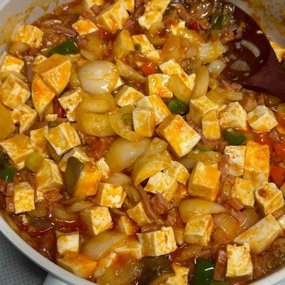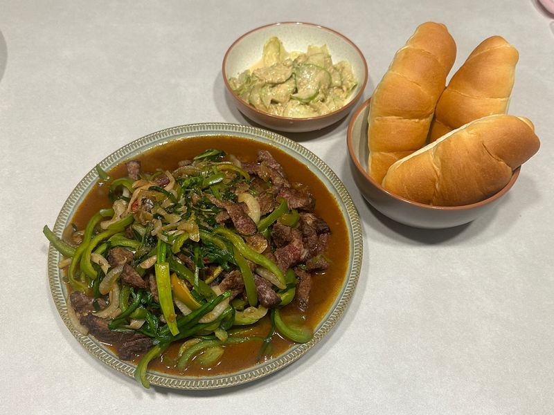 예열한 팬에 기름 둘러서 고기를 익혀준 후에 소스 투하하고 20초 센불에 볶아서 채썰어 준비한 양파와 피망을 넣고 1분 30초 더 볶아준다!