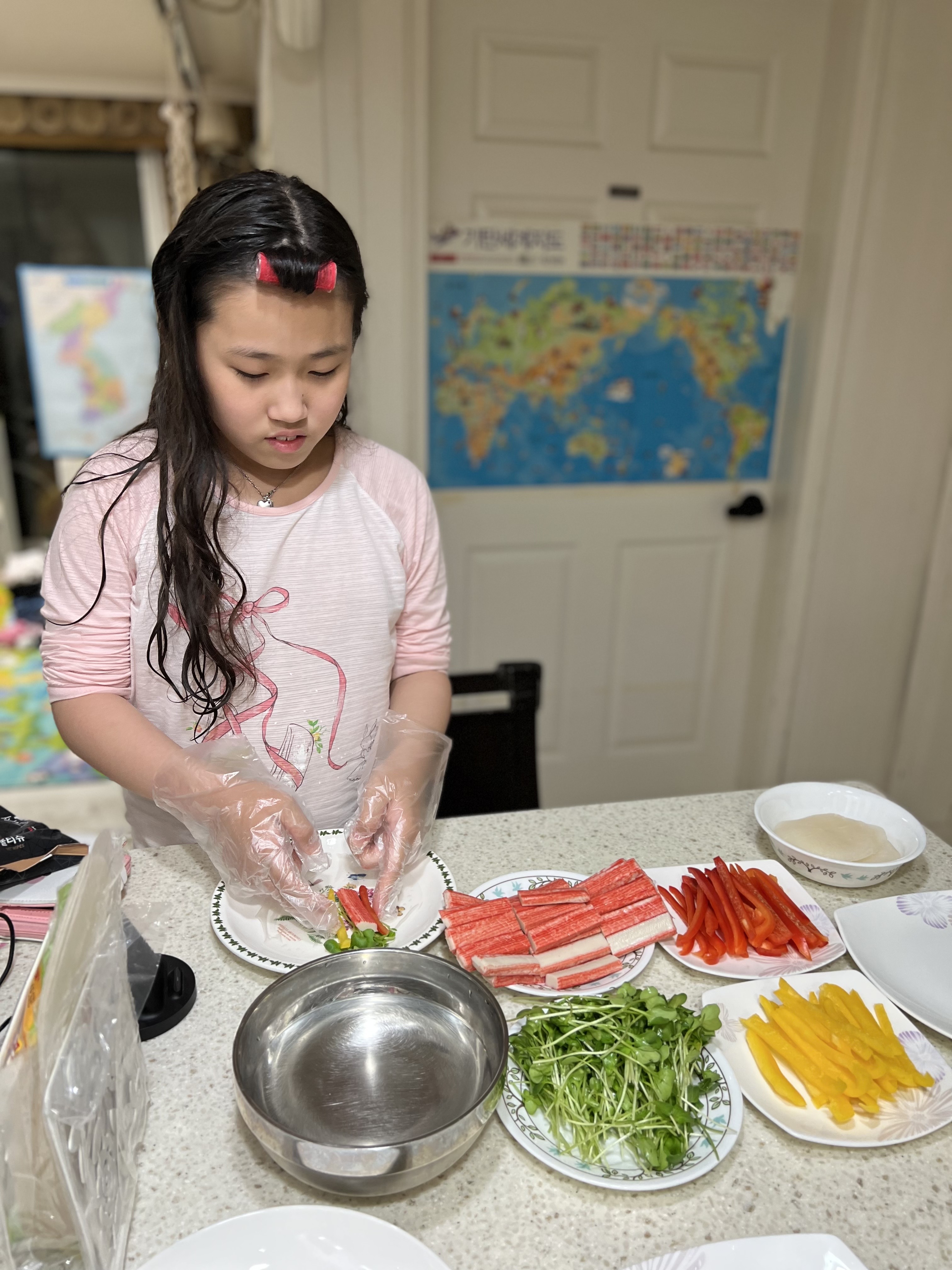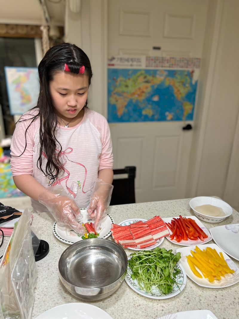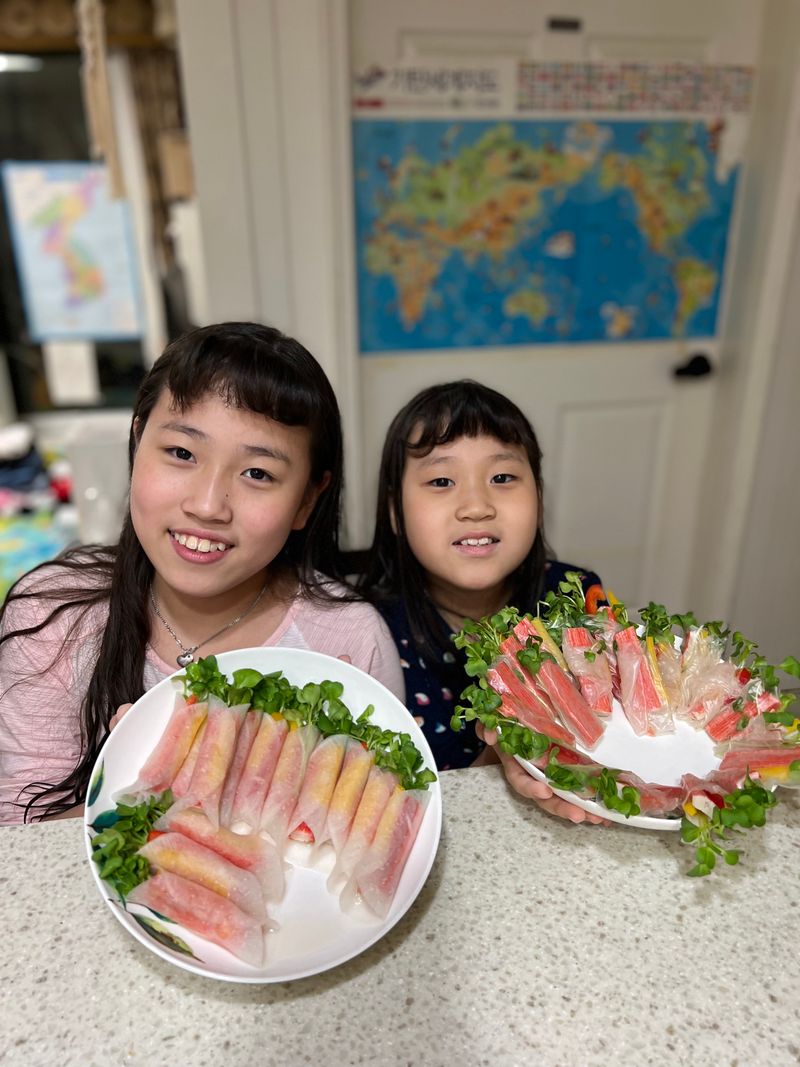 무럭무럭 자라난 무순을 어떻게 먹을지 고민하다가 아이들과 함께 말이를 만들어서 먹었어요.