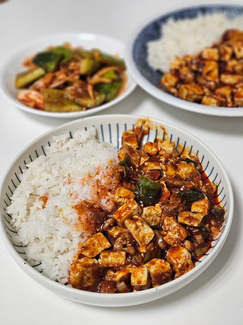 오이를 으깨서 소금에 절여 양파, 식초, 설탕, 마라샹궈소스만 넣으면 오이무침 완성! 고기와 대파 볶다가 마파두부소스 넣으면 시추안마파두부도 완성! 나머지 훠궈소스와 짜장도 주말에 도전할 계획입니다.