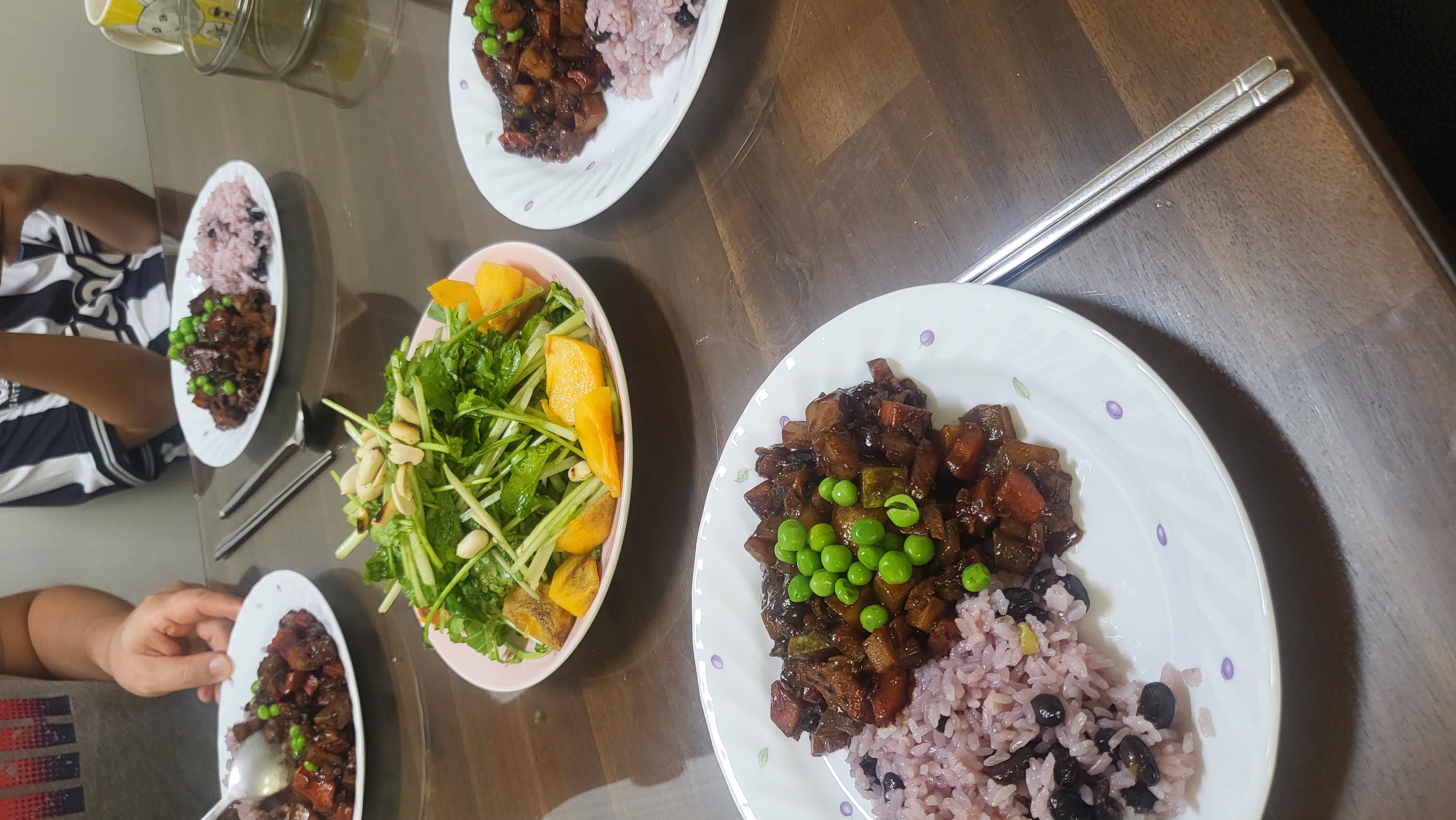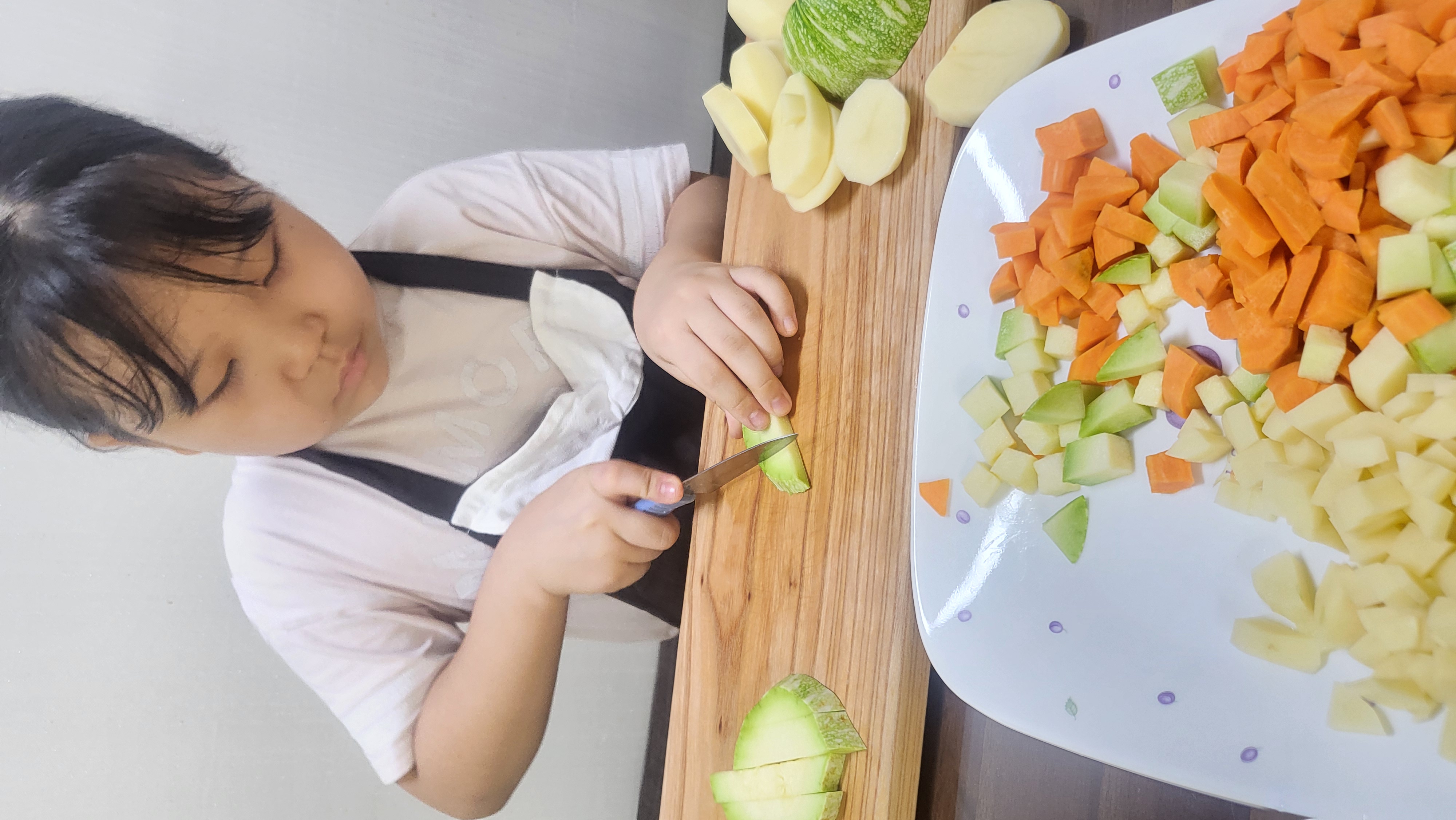 딸이 차분하게 야채자르는 동안