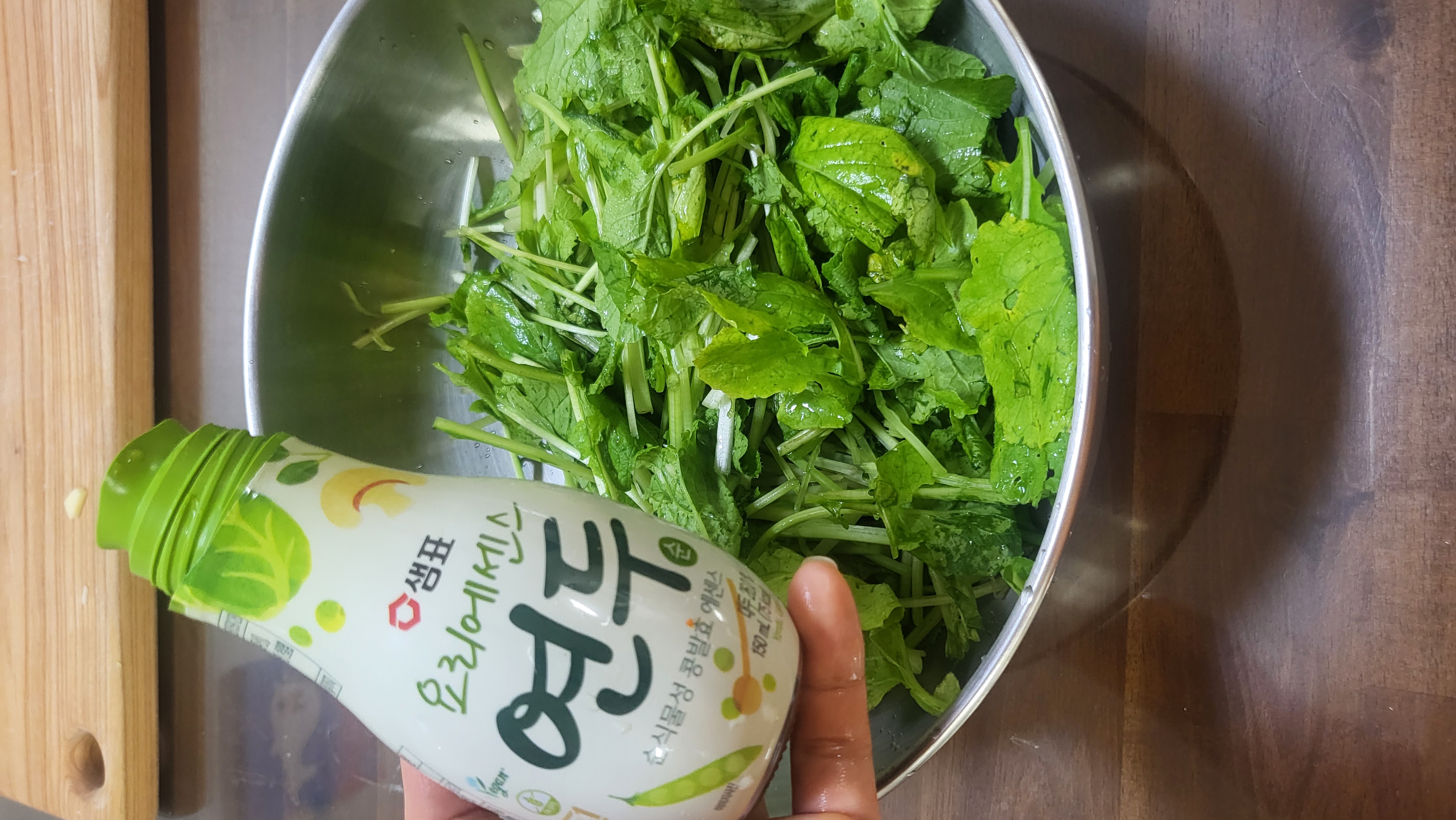 물기 털고 연두한숟가락 ,식초두숟가락, 깨, 스테비아설탕넣고 버무리기~^^♡