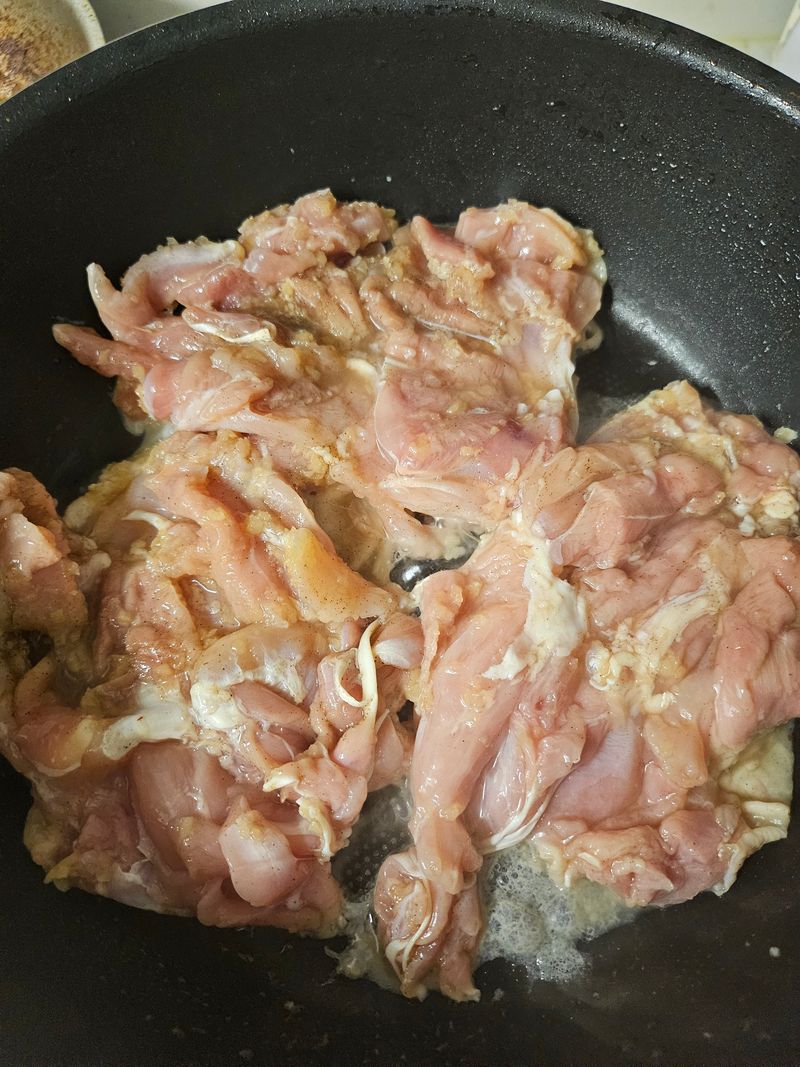 전날 닭다리살에 맛술, 마늘, 후추를 넣고 재워두었다.