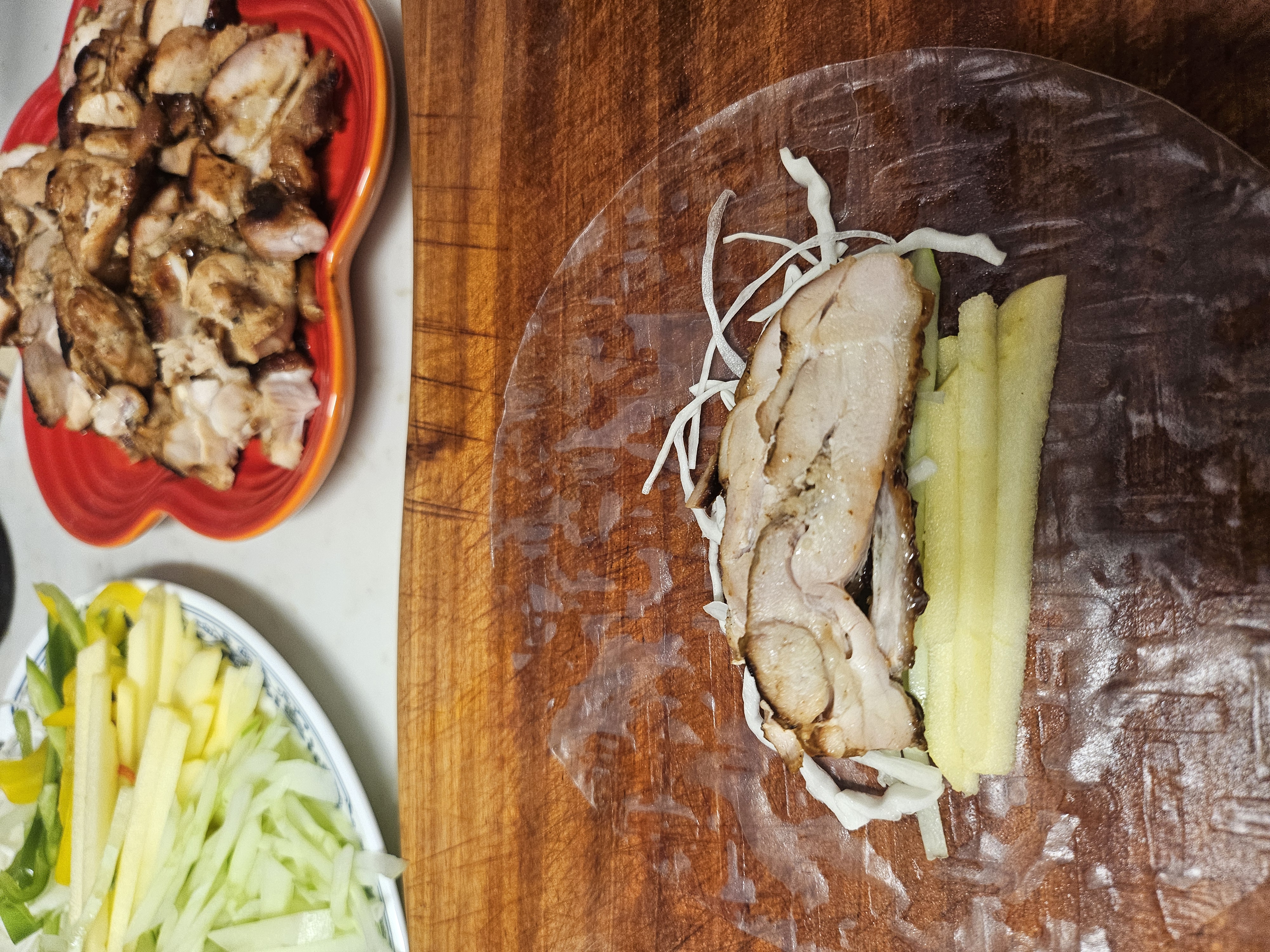 4. 라이스페이퍼 가운데에 채 썬 사과, 오이, 양배추, 피망을 넣고 자른 닭다리살을 올린다.