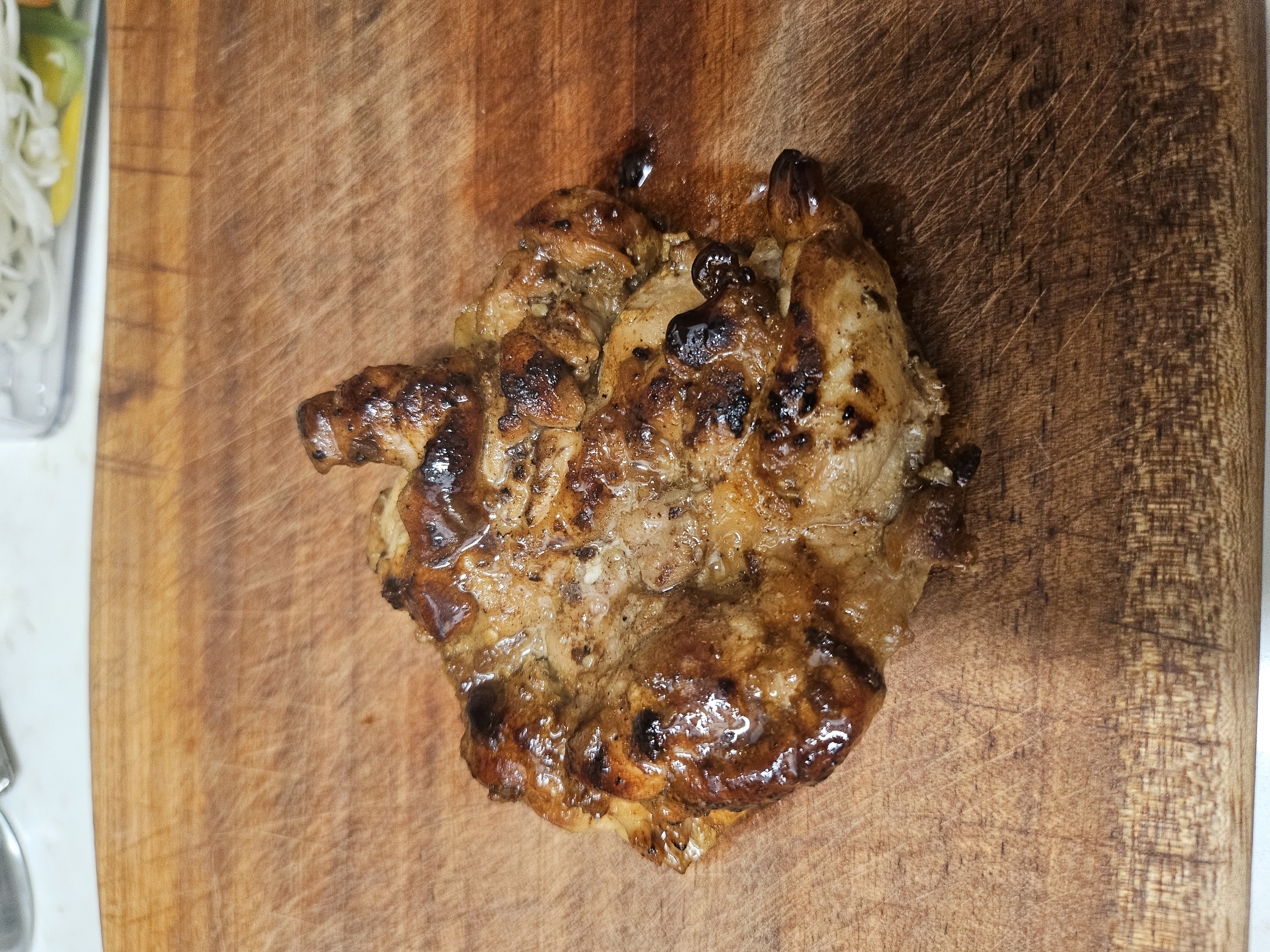 1. 전날 재워둔 닭다리살을 초벌한후 간장 양념을 발라 앞뒤로 노릇하게 구워준다.